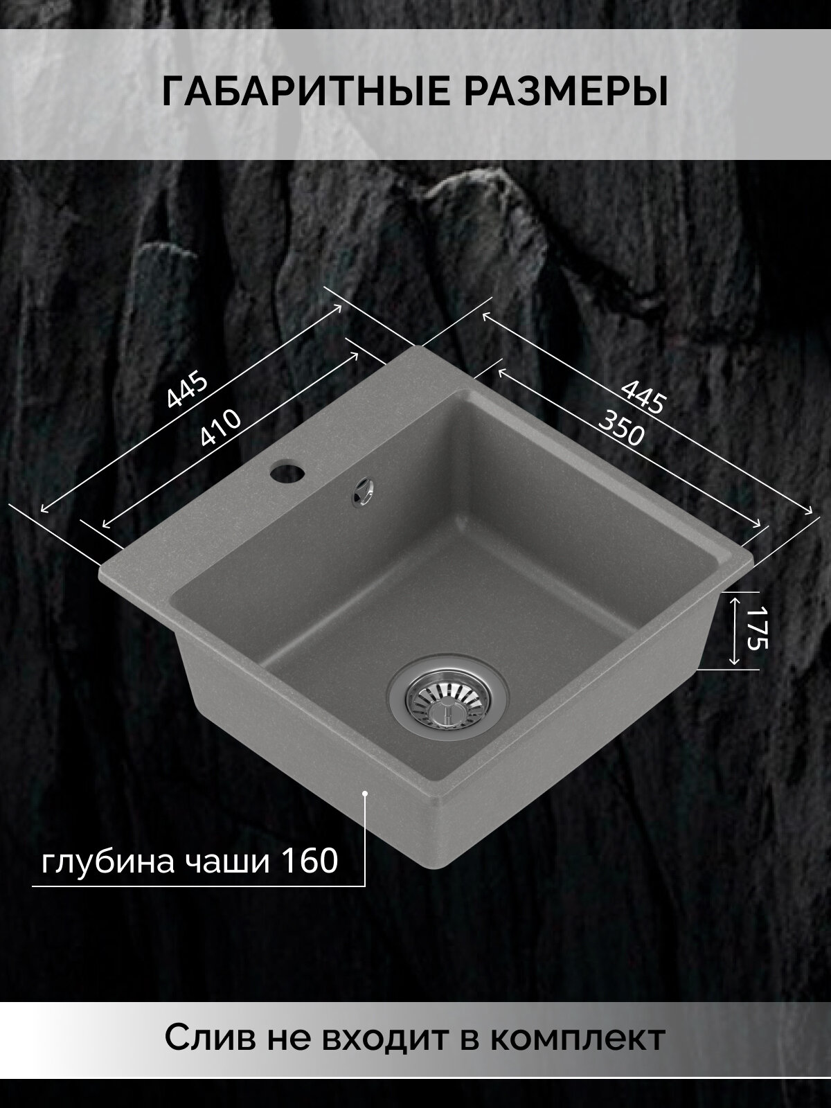 Мойка для кухни каменная черно-серый 45х51, врезная/подстольный монтаж, прямоугольная