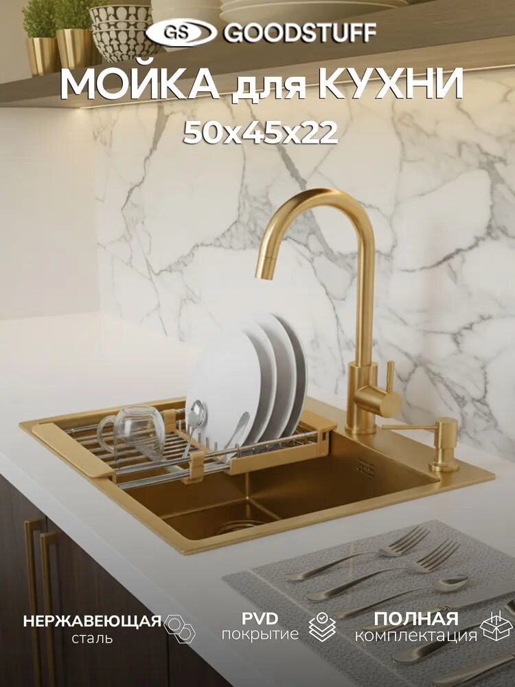 Купить Мойка для кухни GoodStuff, нержавеющая сталь 50х45 золотая, врезная с доставкой по всей России. Мойка для кухни GoodStuff, нержавеющая сталь 50х45 золотая, врезная: сравнение цен, характеристики, фото, актуальное наличие и цены.
