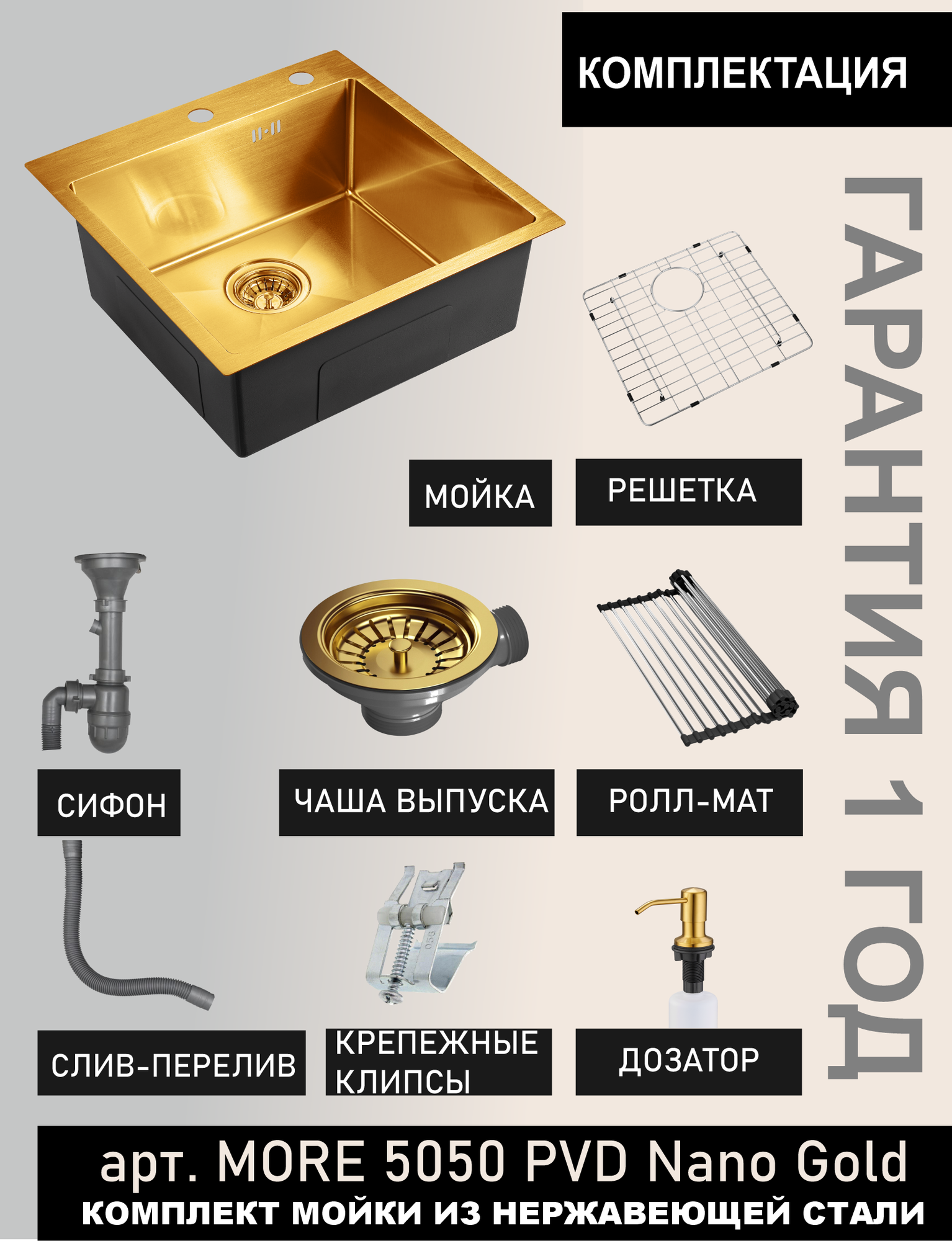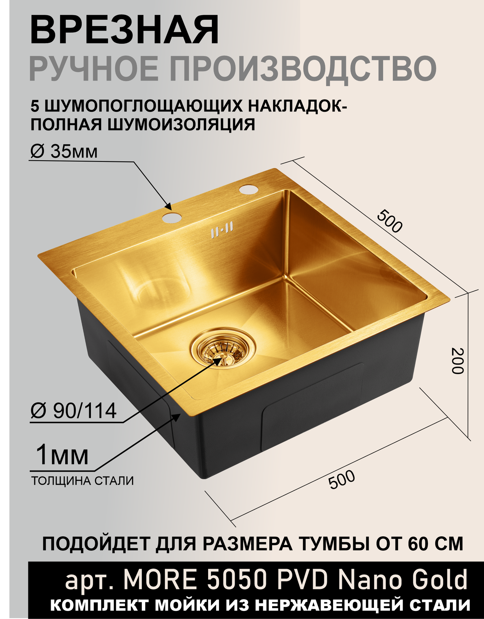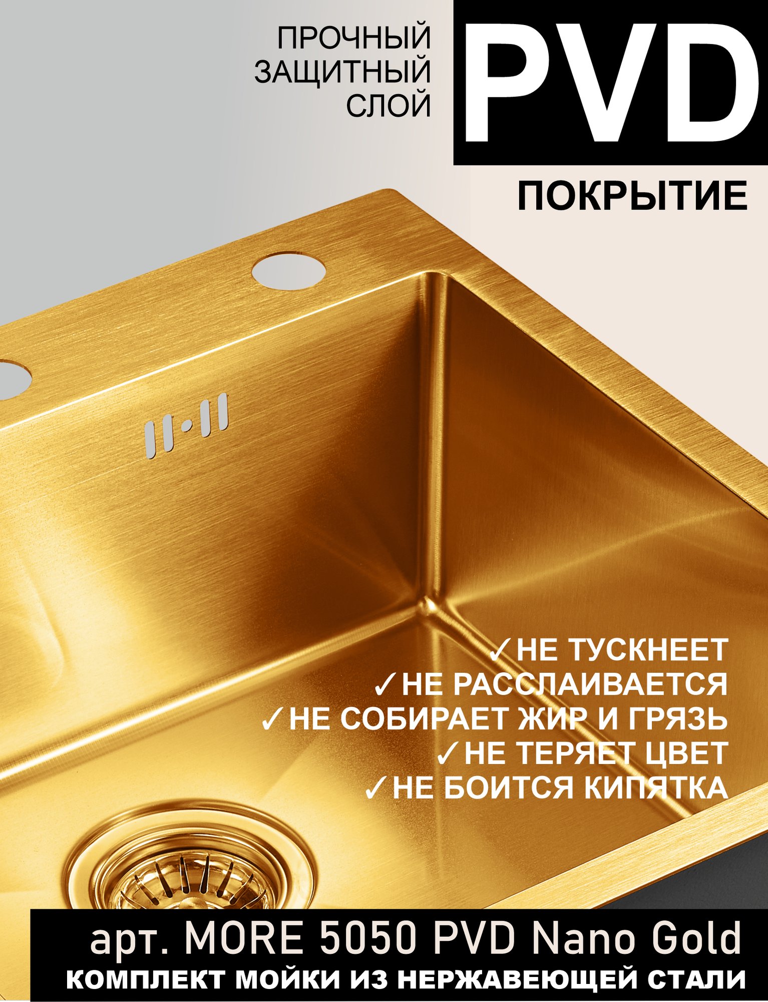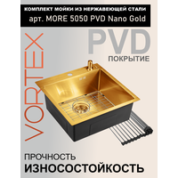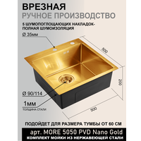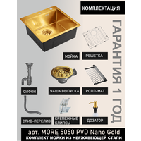 Мойка для кухни 50х50 см золото MORE 5050 PVD Nano Golden нержавеющая сталь с PVD покрытием, решетка на дно, ролл матт, дозатор, сифон, перелив: сравнение цен, характеристики, фото, актуальное наличие и цены.