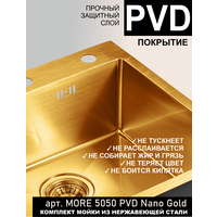 Купить Мойка для кухни 50х50 см золото MORE 5050 PVD Nano Golden нержавеющая сталь с PVD покрытием, решетка на дно, ролл матт, дозатор, сифон, перелив с доставкой по всей России.