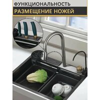 Кухонная раковина черная имеет следующие размеры: ширина 68 см, глубина 45 см, высота 20 см. Размер чаши: ширина 63 см, глубина 36 см, высота 20 см. Для врезной установки столешница должна иметь следующие размеры: ширина 63 см, глубина 36 см.