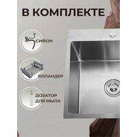 Мойка для кухни из нержавеющей стали GoodStuff (60х50 см) - стильный и функциональный аксессуар для вашей кухни. Поставляется мойка в комплекте c сифоном, коландером и дозатором для мыла. Кухонная мойка изготовлена из нержавеющей стали, что гарантирует долговечность и надежность в использовании. Толщина чаши мойки 0,8 мм Толщина бортика мойки - 3 мм Цвет серебро, сифон в комплекте. Нержавеющая сталь марки SUS 304 относится к пищевым хромомарганцевым сплавам, которые соответствуют всем санитарно-гигиеническим требованиям. Она стабильна в средах, где повышена концентрация щелочей и кислот. • Металл инертен при контактах с продуктами. • Сплав коррозионно устойчив, стабилен в химически агрессивных средах; • Хорошо переносит значительные колебания температур, сохраняя свои прочностные характеристики; • Сталь надежная, прочная и пластичная, устойчивая к износу; • Легко поддается горячей и холодной обработке, свариванию, резке, ковке, высадке; • Не содержит токсинов и вредных примесей; • Характеризуется повышенной трещиностойкостью; • Нержавейка хорошо прокаливается, отличается высокой твердостью; • Можно применять для работы в средах органических кислот; Прямоугольная форма мойки и чаши позволяет максимально эффективно использовать пространство на кухне. Раковина из нержавеющей стали имеет хорошую шумоизоляцию, что прибавляет комфорт при её использовании. Выбирая мойку для кухни GoodStuff из нержавейки (60х50 см) с сифоном в цвете хром - вы получаете стильный и функциональный аксессуар для вашей кухни, который прослужит вам долгие годы.