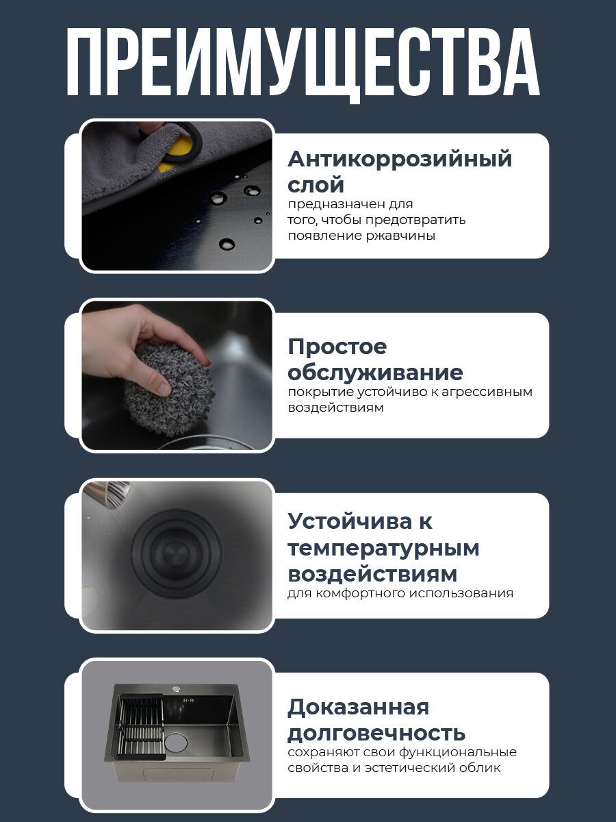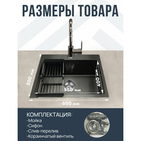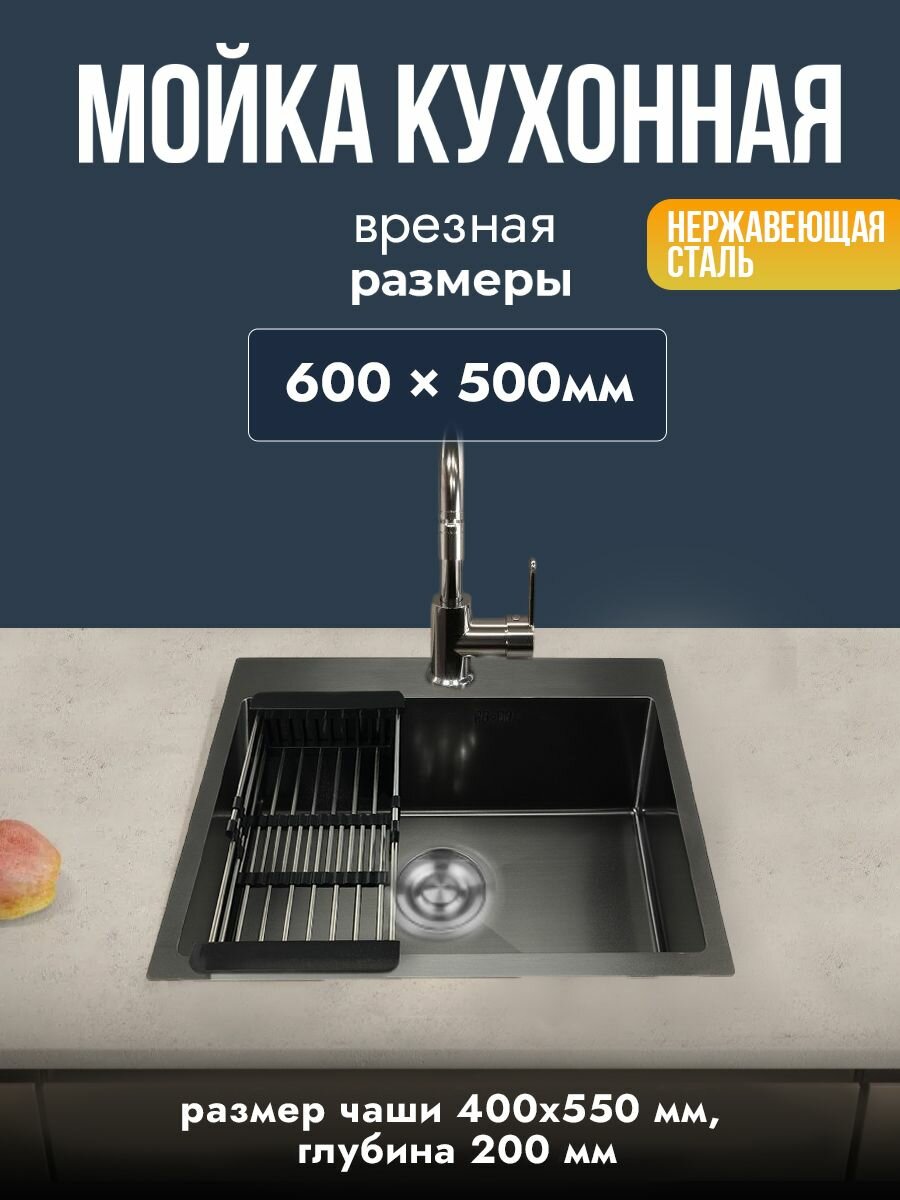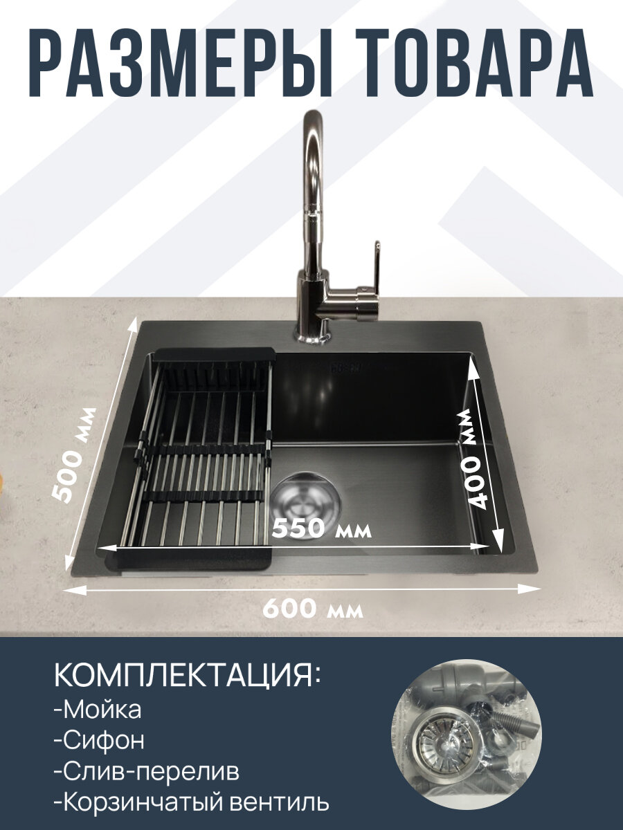 Мойка для кухни 60х50 см графит толщина 3,0 х 0,8/200 мм сифон с переливом + корзина, нержавеющая сталь, 1 шт.: сравнение цен, характеристики, фото, актуальное наличие и цены.