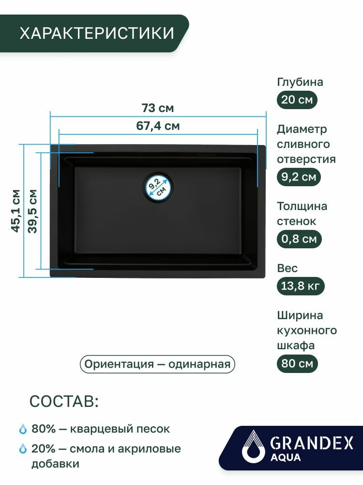 Мойка для кухни черная врезная каменная 730х451х200 мм Grandex Aqua COMFORT 73U, кварц, карбон, выпуск с сифоном: сравнение цен, характеристики, фото, актуальное наличие и цены.