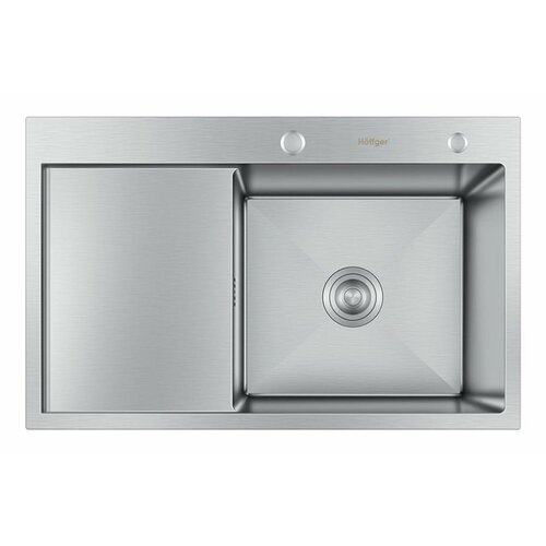 Мойка для кухни HOFFGER 7850R SATIN (Чаша справа). Многофункциональная кухонная мойка Hoffger HFG-7850S-R Satin (Сталь сатин), чаша справа, крыло слева, с двумя отверстиями под смеситель и дозатор. Изготовлена из высококачественной нержавеющей стали AISI304, которая придает изделию особую прочность и коррозионную устойчивость. Толщина борта мойки 3 мм, толщина чаши 1 мм. Мойка имеет закруглённые внутренние углы и дно с небольшим уклоном, чтобы вода не застаивалась в чаше - эти свойства облегчают дальнейший уход за ней. Имеет шумоизолирующее покрытие и накладки с обратной стороны, которые делают мойку тихой при эксплуатации. Производственное оборудование в стране-изготовителе европейское, включая специалистов, сопровождающих немецкую торговую марку, полный контроль качества и проведение испытаний согласно сантехническим гостам и ТУ. Монтаж врезной над столешницей, накладная. Нержавеющая сталь; Толщина мойки: 3/1 мм; С двумя отверстиями под смеситель и дозатор; Врезной (верхний) монтаж; Выпуск в цвет мойки, 3 1/2 дюйма; Сифон с переливом, сливная арматура в комплекте; Уклон дна к выпуску для лучшего водостока. Возможна установка измельчителя пищевых отходов. Шумопоглащающие накладки со всех сторон.