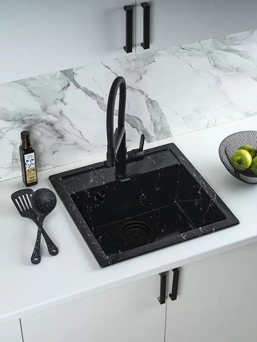 Мойка для кухни WISENT WA11-11 из искусственного камня представляет собой стильное и функциональное решение для вашей кухни. Изготовленная в Беларуси, эта мойка сочетает в себе прочность и долговечность, а также элегантный черно-белый мраморный дизайн с белыми прожилками.