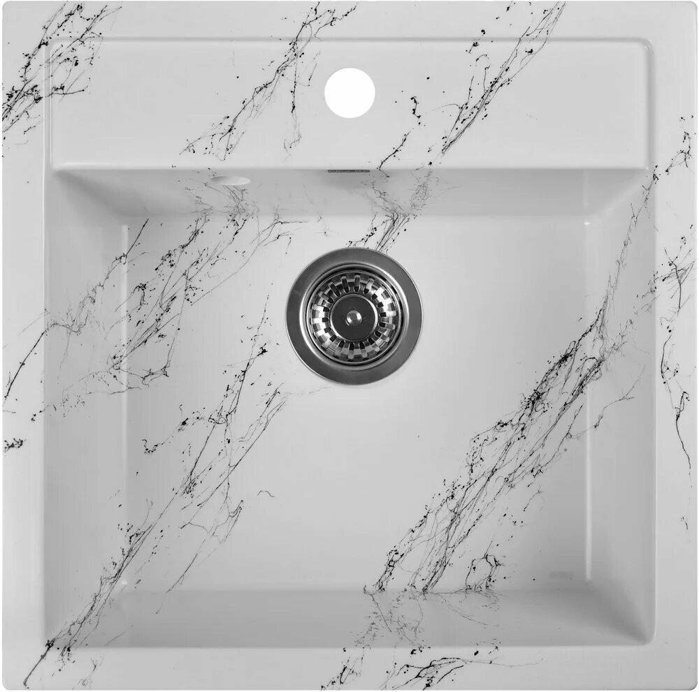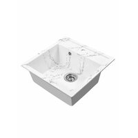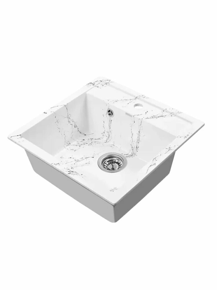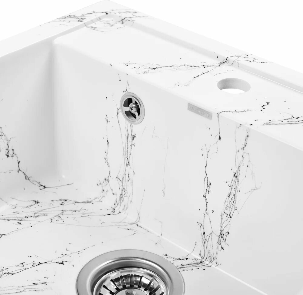 Мойка выполнена в белом цвете с черными прожилками, что придает ей элегантный и современный вид. Прямоугольная форма мойки с глубокой чашей и симметричными сторонами обеспечивает удобство и практичность в использовании.
