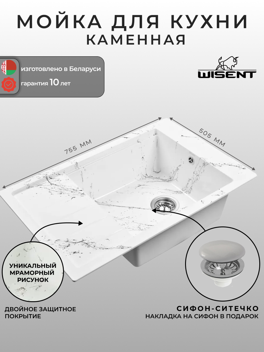 Мойка для кухни из искусственного камня WISENT WB28-12 Мрамор Бело-черный (беларусь) 510*780*220: сравнение цен, характеристики, фото, актуальное наличие и цены.