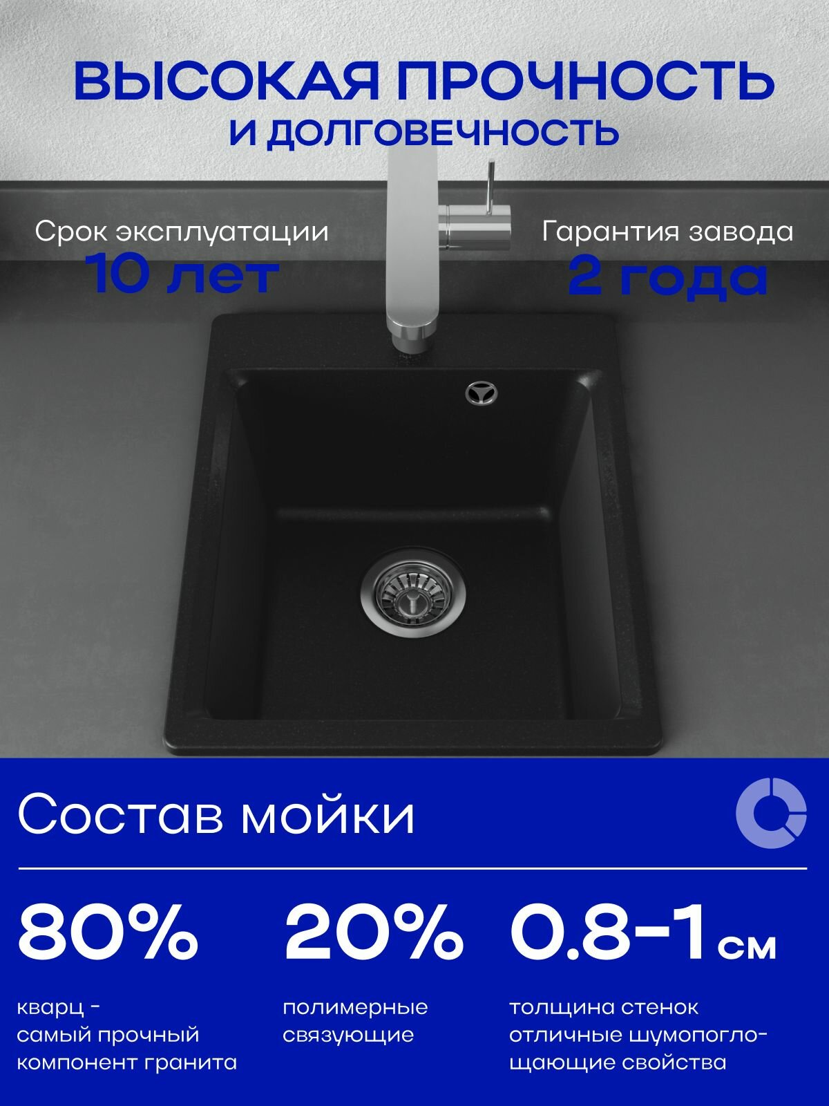 Мойка для кухни угловая, в составе которой содержится самый прочный компонент натурального гранита (мрамора) – кварцевый песок, имеет также защитный слой гелькоут. Такой материал является химически устойчивым, обладает высокой механической прочностью и антибактериальными свойствами, поэтому изделие не потеряет своих первоначальных свойств и внешнего вида долгие годы.