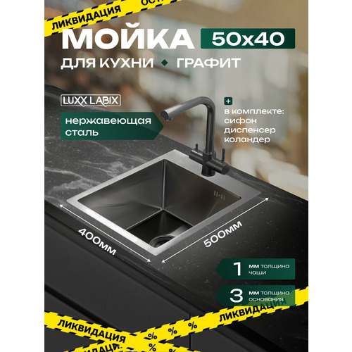 Обращаем внимание покупателей LUXX LABIX, что недорогая бюджетная цена наших кухонных моек из нержавеющей стали связана с незначительными внешними мелкими потертостями или неглубокими царапинами, что никак не влияет на потребительские свойства наших раковин для кухни. Это мойки премиального сегмента с небольшими внешними косметическими недочетами. Все наши эконом мойки выполнены из качественной нержавеющей стали с большим запасом прочности, используемой в пищевой промышленности. Эти кухонные раковины нержавеющие 2 сорта не подвержены коррозии, деформации и прослужат также долго, как и более дорогие известные мойки. В комплекте с компактной раковиной железной 40х50 идет сливная арматура и каландр для сушки посуды, мытья и размораживания продуктов. Глубокая и компактная стальная раковина в цвете графит как воплощение практичности в быту. Антибактериальное покрытие PVD мойки всегда остаётся чистым, не собирает воду и частицы грязи из-за особенности конструкции и покрытия раковины железной. Шумоизоляционное покрытие поглощает шум воды из крана. Вместительная чаша глубиной 21 см позволяет расположить в мойке врезной крупную посуду. Раковину для кухни можно установить как сверху так и снизу столешницы, т. е. может быть и накладной мойкой и врезной. Мойка подходит и для подстольного монтажа, если вы ищете мойку кухонную под столешницу. На прямоугольной нерж мойке 40*50 предусмотрено отверстие для смесителя. Квадратная железная раковина не боится агрессивной среды, бытовой химии и прослужит долгие годы. Наши бюджетные мойки нержавейка эконом варианта имеют специальное покрытие, которое не впитывает грязь, жир, масло и устойчиво к воздействию агрессивных сред. Ее можно установить на даче, съемной квартире, в деревне. Это недорогой и качественный вариант мойки на кухню. Прямоугольная мойка из нержавеющей стали изменит ваше представление об удобстве в быту. Сделайте заказ сейчас по доступной цене и оцените преображение интерьера уже в самое ближайшее время!