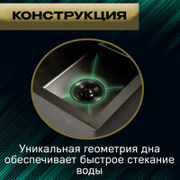 С обратной стороны чаши установлены специальные шумоизоляционные пластины, которые в свою очередь поглощают шум воды из крана, а также не дают скапливаться конденсату. Черна мойка на кухню нержавейка имеет врезную конструкцию, что позволяет легко встраивать сверху, интегрировать её в столешницу, или подстольного монтажа. Она также оснащена бортиком, который предотвращает переливание воды на поверхность столешницы.