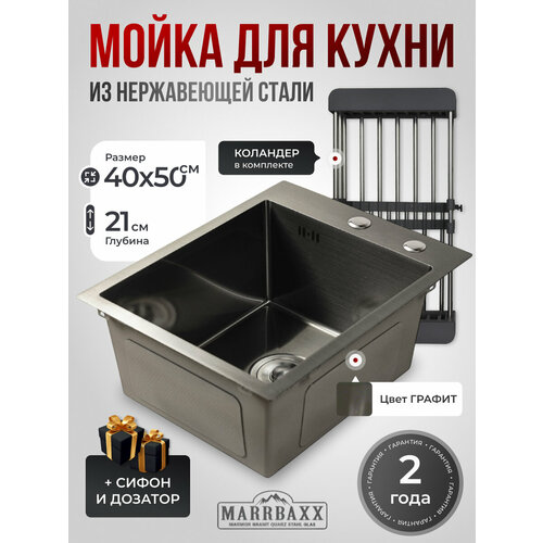 В комплекте с компактной раковиной железной 40х50 идет сливная арматура и каландр для сушки посуды, мытья и размораживания продуктов. Глубокая и компактная стальная раковина в цвете графит как воплощение практичности в быту. Антибактериальное покрытие PVD мойки всегда остаётся чистым, не собирает воду и частицы грязи из-за особенности конструкции и покрытия раковины железной. Шумоизоляционное покрытие поглощает шум воды из крана. Вместительная чаша глубиной 21 см позволяет расположить в мойке врезной крупную посуду. Раковину для кухни можно установить как сверху так и снизу столешницы, т. е. может быть и накладной мойкой и врезной. Мойка подходит и для подстольного монтажа, если вы ищете мойку кухонную под столешницу. На прямоугольной нерж мойке 40*50 предусмотрено отверстие для смесителя. Квадратная железная раковина не боится агрессивной среды, бытовой химии и прослужит долгие годы. Наши мойки нержавейка имеют специальное покрытие, которое не впитывает грязь, жир, масло и устойчиво к воздействию агрессивных сред. Ее можно установить на даче, съемной квартире, в деревне. Это недорогой и качественный вариант мойки на кухню. Прямоугольная мойка из нержавеющей стали изменит ваше представление об удобстве в быту. Сделайте заказ сейчас по доступной цене и оцените преображение интерьера уже в самое ближайшее время!