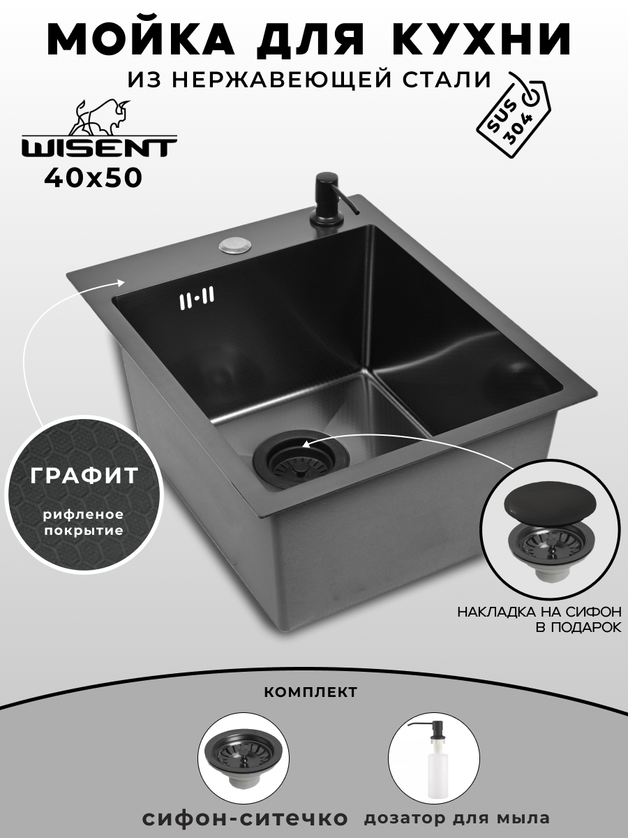 Мойка для кухни нержавеющая 40х50, рифленая, с PVD покрытием графит. Сифон с ситечком, дозатор.: сравнение цен, характеристики, фото, актуальное наличие и цены.