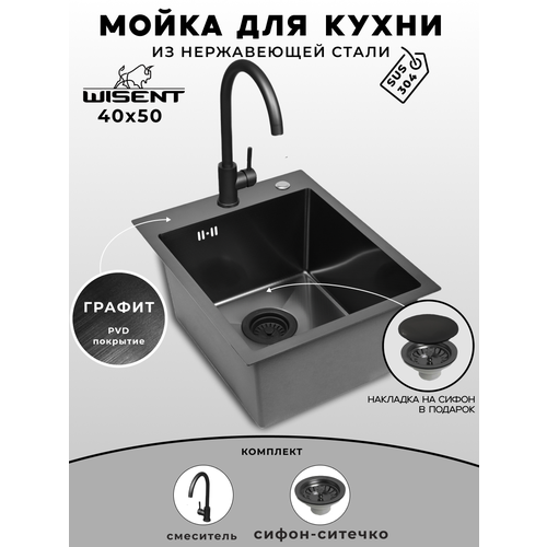 Мойка для кухни нержавеющая 40х50, с PVD покрытием графит. Смеситель, сифон с ситечком.