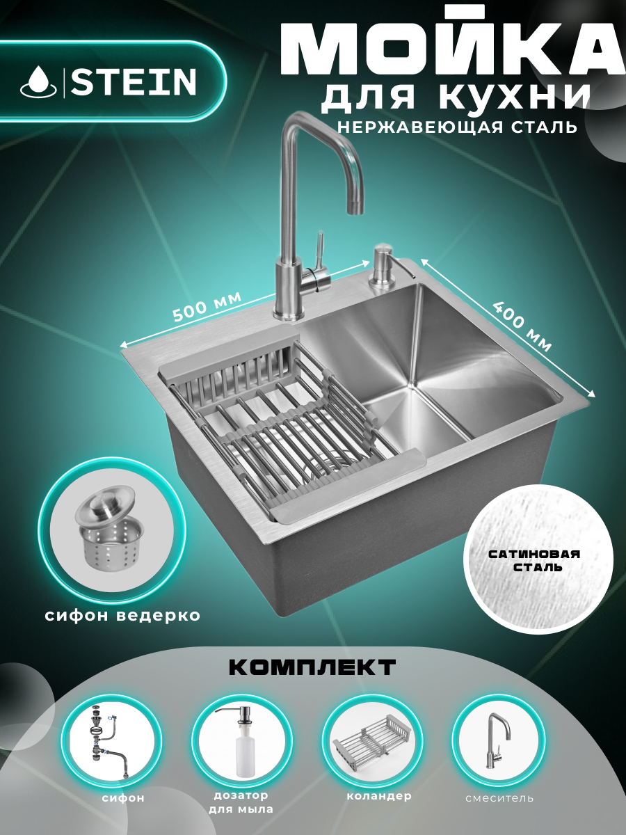 Мойка для кухни нержавеющая 50х40. Смеситель, Сифон с ведерком, дозатор, коландер. ST35040/W02-114/W405A/W302644/W4998-4: сравнение цен, характеристики, фото, актуальное наличие и цены.