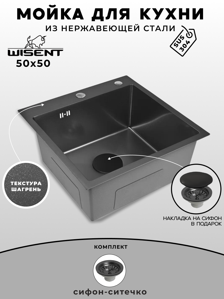 Мойка для кухни нержавеющая 50х50, с PVD покрытием графит, текстура Шагрень. Сифон с ситечком. WGS35050BT/WGER019B: сравнение цен, характеристики, фото, актуальное наличие и цены.