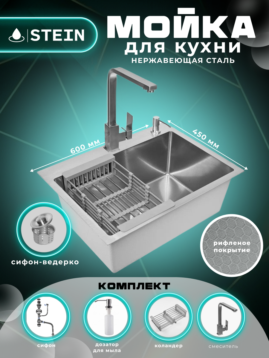 Мойка для кухни нержавеющая 60х45, рифленая. Смеситель, Сифон с ведерком, дозатор, коландер.: сравнение цен, характеристики, фото, актуальное наличие и цены.