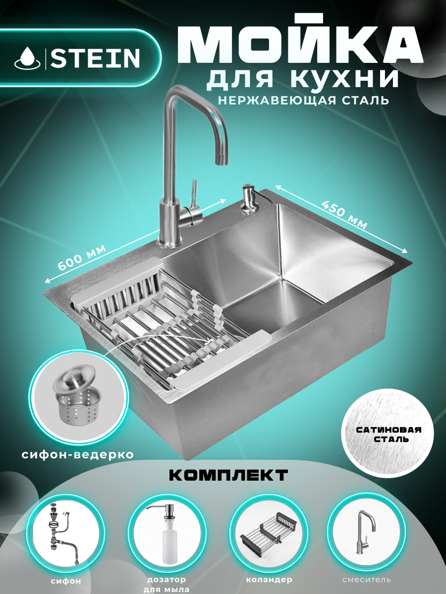 Купить Мойка для кухни нержавеющая 60х45. Смеситель, Сифон с ведерком, дозатор, коландер. ST36045/W02-114/W405A/W302644/W4998-4 с доставкой по всей России.