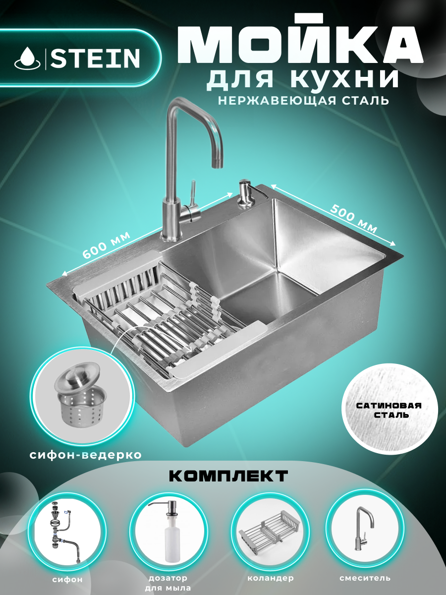 Купить Мойка для кухни нержавеющая 60х50. Смеситель, Сифон с ведерком, дозатор, коландер. ST36050/W02-114/W405A/W302644/W4998-4 с доставкой по всей России.