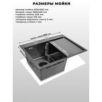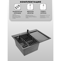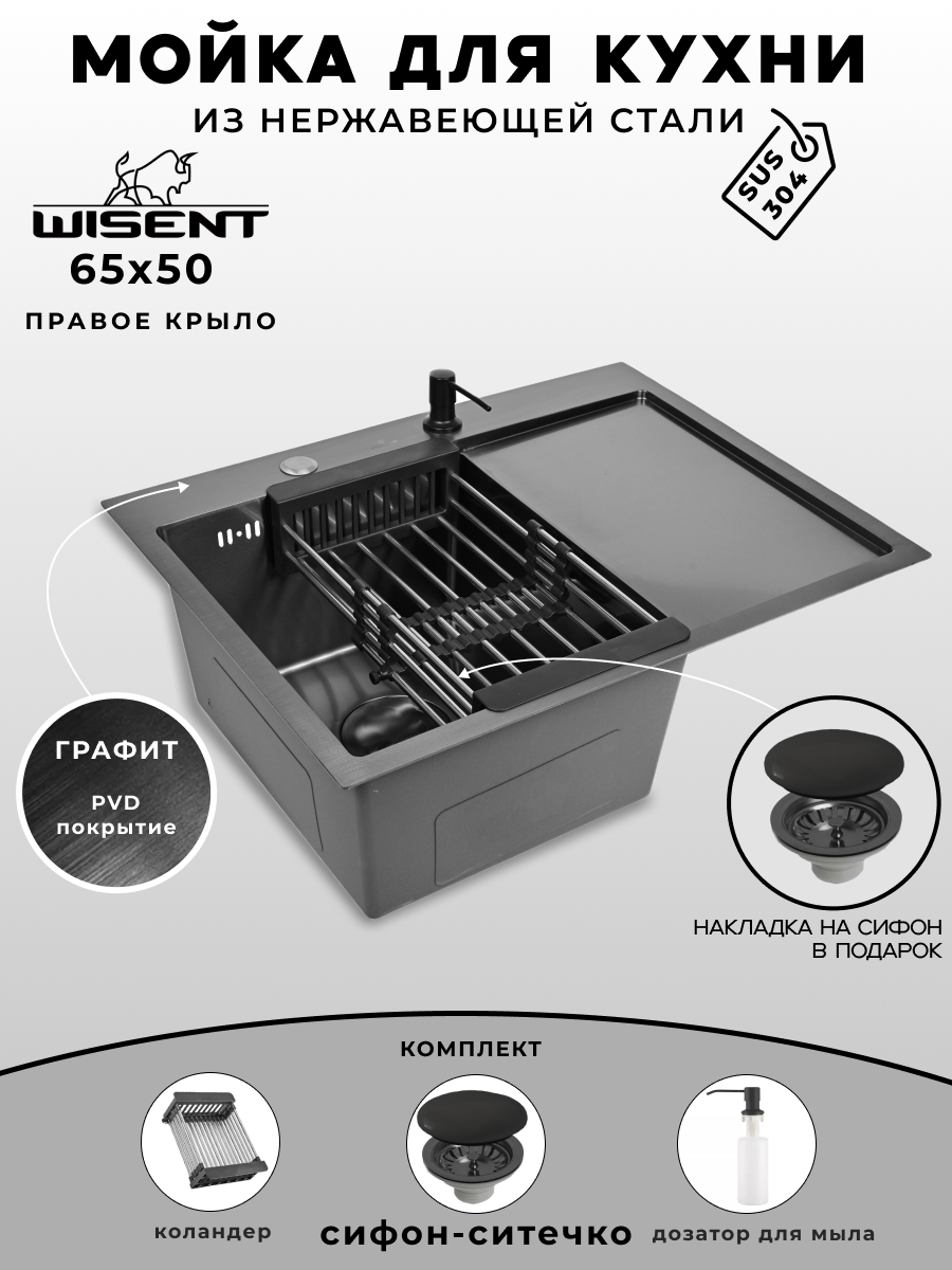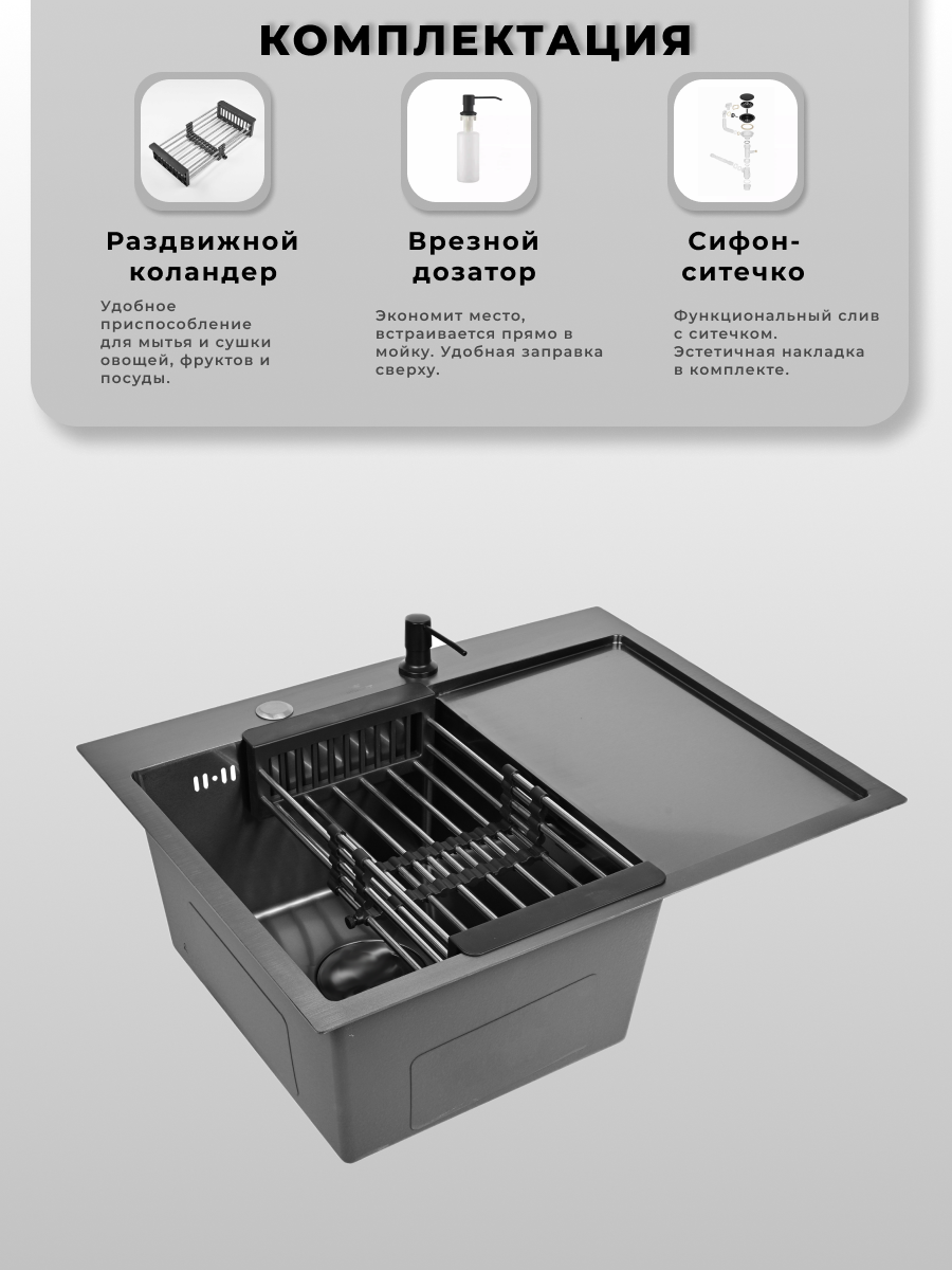 Мойка для кухни нержавеющая 65х50, с PVD покрытием графит, с правым крылом. Сифон с ситечком, дозатор, коландер.