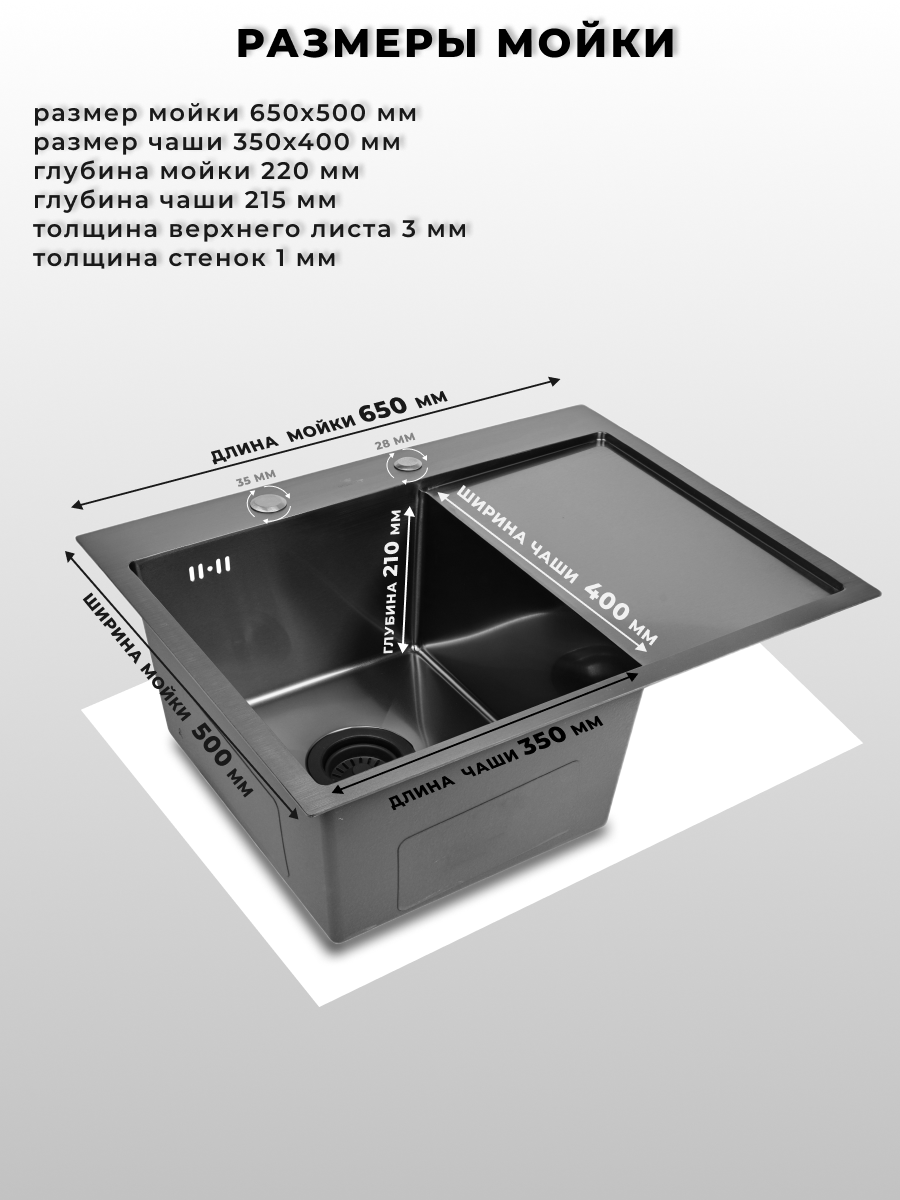 Размеры мойки: 65х50. Размеры чаши: 35х40. В связи с особенностями производства в геометрии мойки, при прилегании к столешнице, допустимо расхождение 1-3мм.
