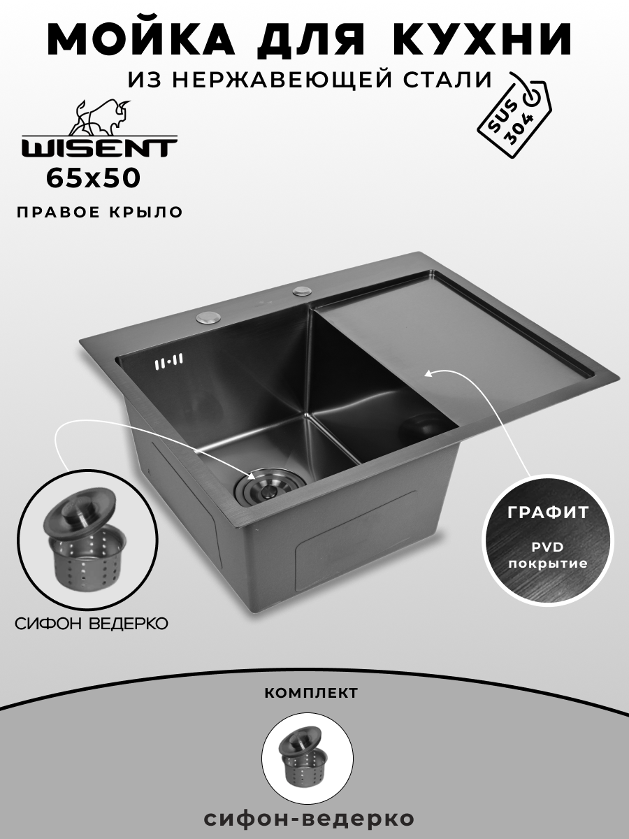 Купить Мойка для кухни нержавеющая 65х50, с PVD покрытием графит, с правым крылом. Сифон с ведерком. с доставкой по всей России. Мойка для кухни нержавеющая 65х50, с PVD покрытием графит, с правым крылом. Сифон с ведерком.: сравнение цен, характеристики, фото, актуальное наличие и цены.