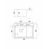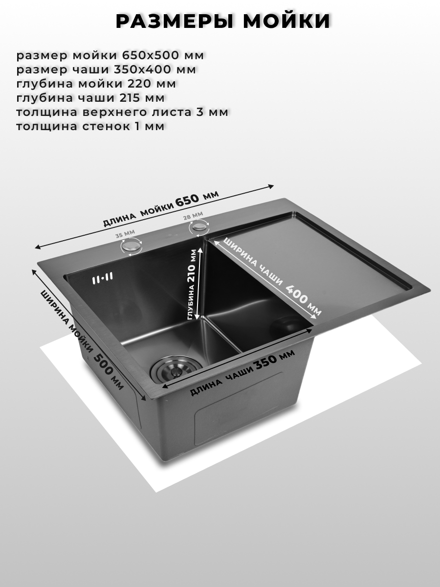 Размеры мойки: 65х50. Размеры чаши: 35х40. В связи с особенностями производства в геометрии мойки, при прилегании к столешнице, допустимо расхождение 1-3мм.