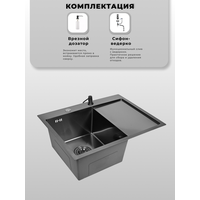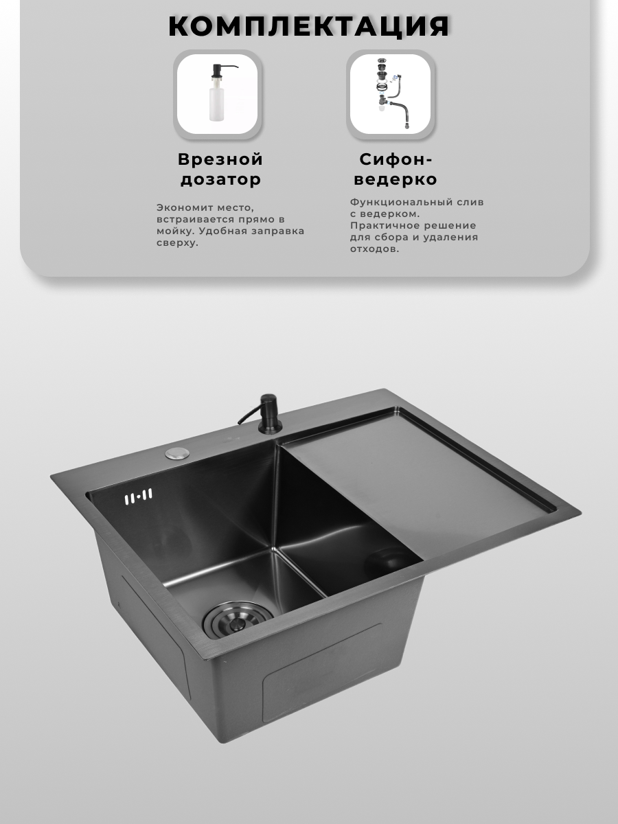 Мойка для кухни нержавеющая 65х50, с PVD покрытием графит, с правым крылом. Сифон с ведерком, дозатор.