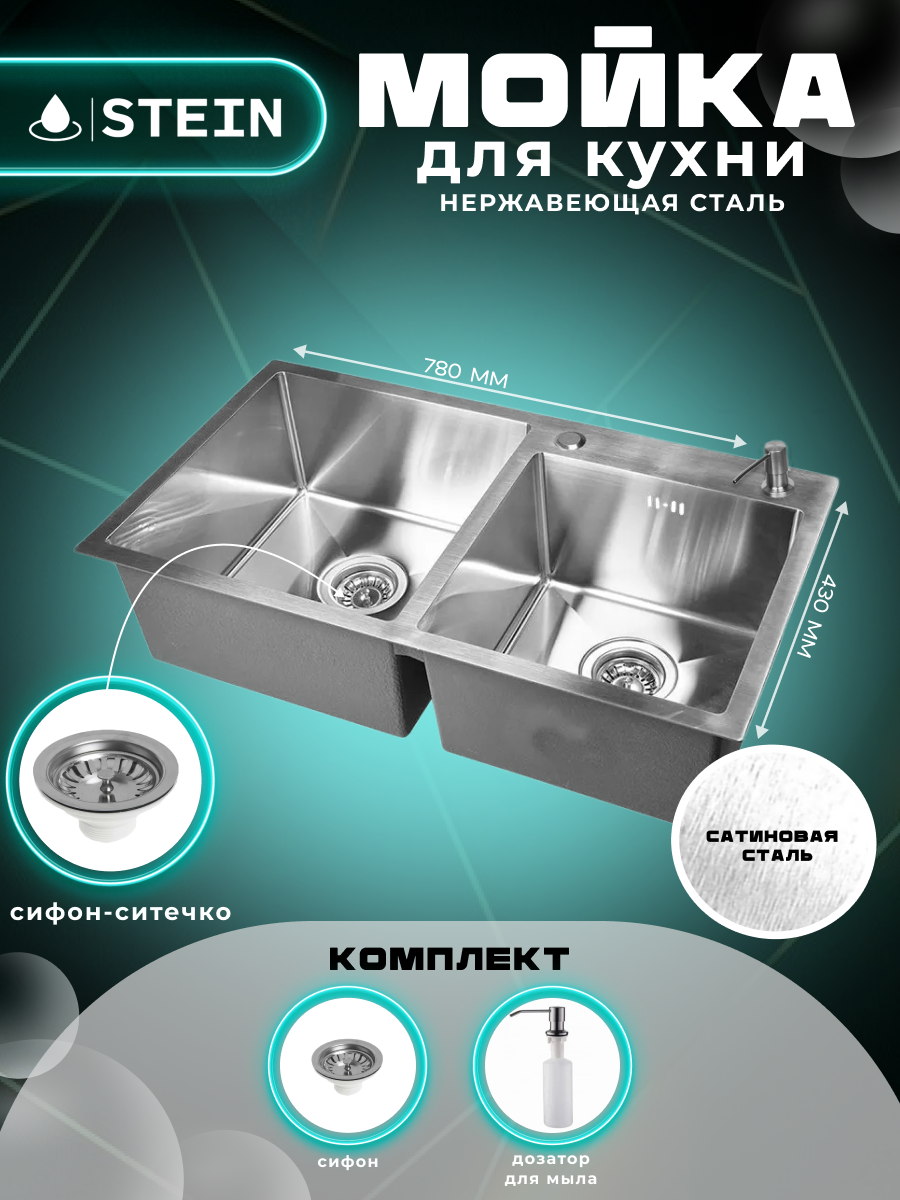 Мойка для кухни нержавеющая 78х43, с двумя чашами. Сифон с ситечком, дозатор. ST37843-S/341-11-24/ST405A: сравнение цен, характеристики, фото, актуальное наличие и цены.