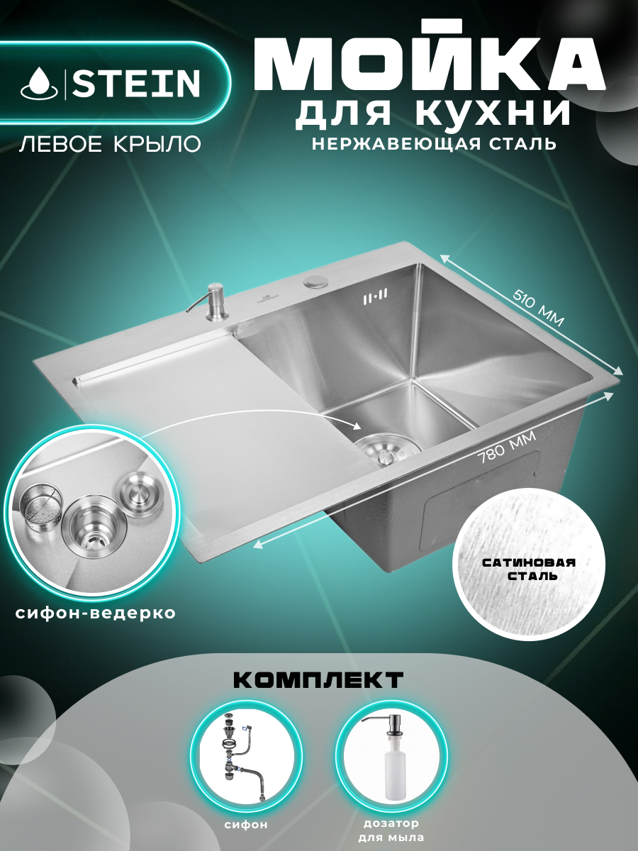 Мойка для кухни нержавеющая 78х51, с левым крылом. Сифон с ведерком, дозатор. ST37851-R/W02-114/W405A: сравнение цен, характеристики, фото, актуальное наличие и цены.
