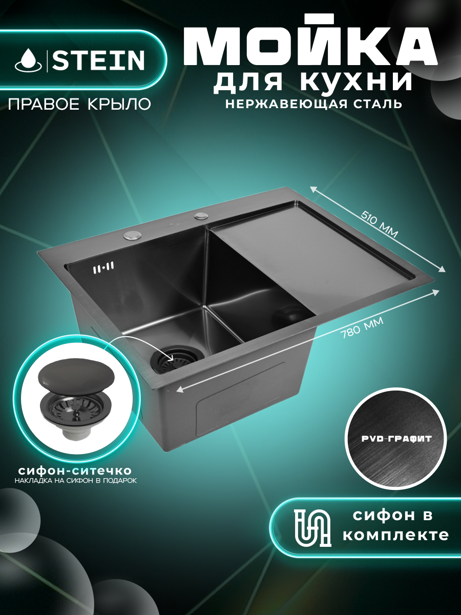 Мойка для кухни нержавеющая 78х51, с правым крылом, с PVD покрытием графит. Сифон с ситечком. ST37851B-L/035B: сравнение цен, характеристики, фото, актуальное наличие и цены.