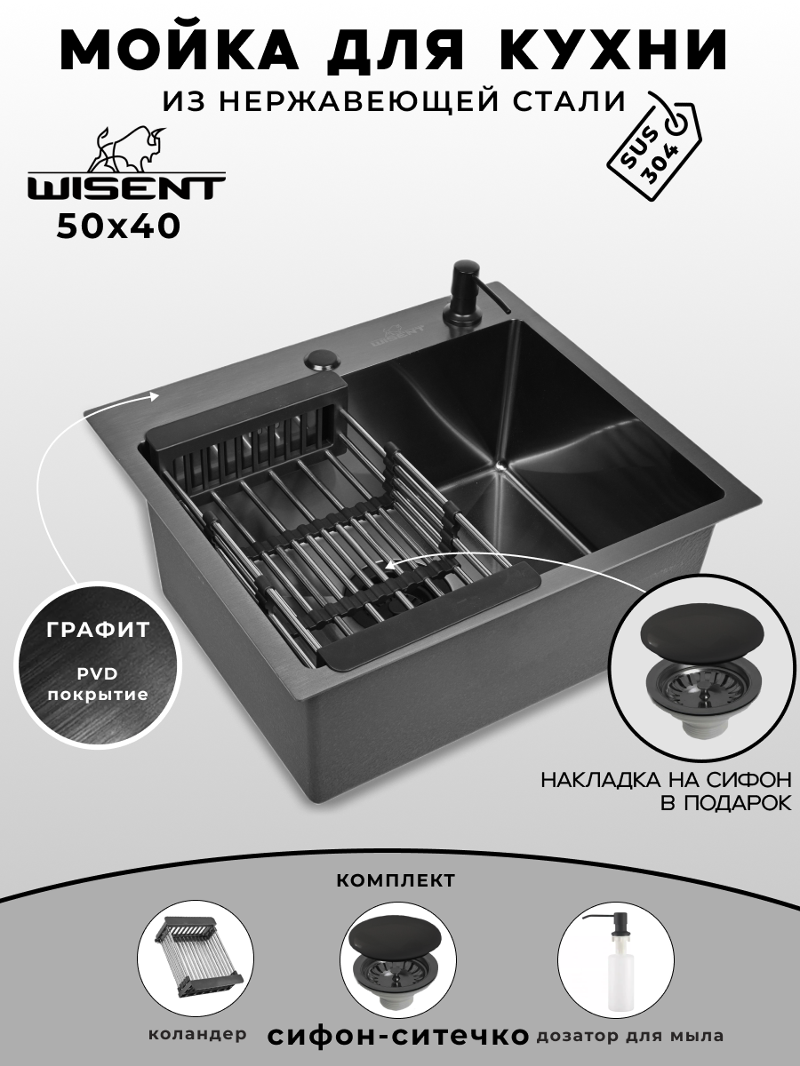 Мойка для кухни нержавеющая 50х40, с PVD покрытием графит. Сифон с ситечком, дозатор, коландер.: сравнение цен, характеристики, фото, актуальное наличие и цены.