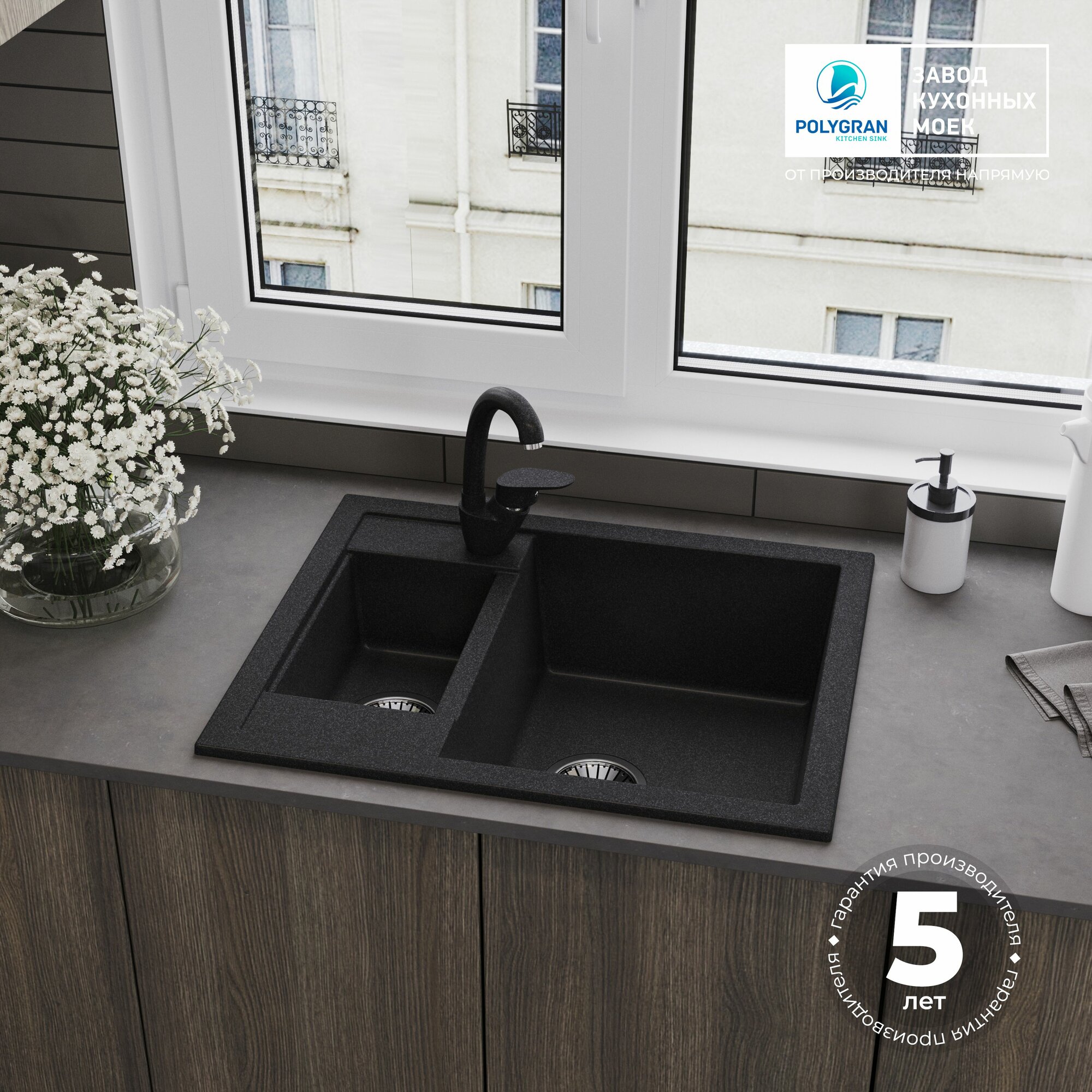 Это материал, который не только устойчив к механическим повреждениям и химическим воздействиям, но и прост в уходе. Кухонная мойка из искусственного камня не теряет своего блеска со временем и не подвержена коррозии. Прямые линии и строгий дизайн делают ее универсальным элементом для разных стилей кухонь — от классики до современного минимализма. Подходит как для крупных кухонь, так и для маленьких, где пространство ограничено.