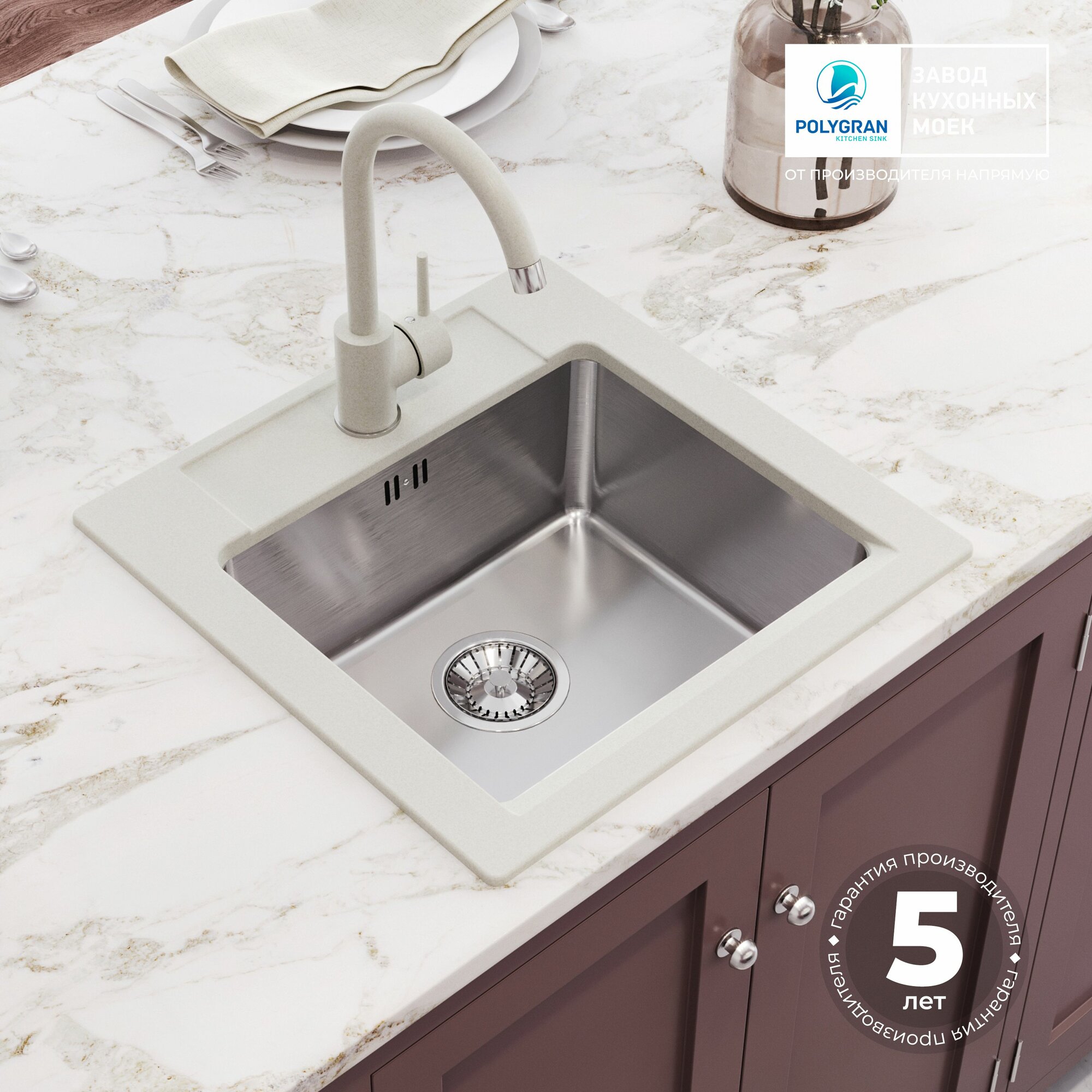 Кухонная мойка из искусственного камня отличается высокой прочностью и устойчивостью к механическим повреждениям. Она легко очищается и не требует сложного ухода, что делает ее идеальной для активной эксплуатации на кухне. Кроме того, раковина устойчива к загрязнениям и обладает антибактериальными свойствами, что обеспечивает гигиеничность в процессе приготовления пищи.