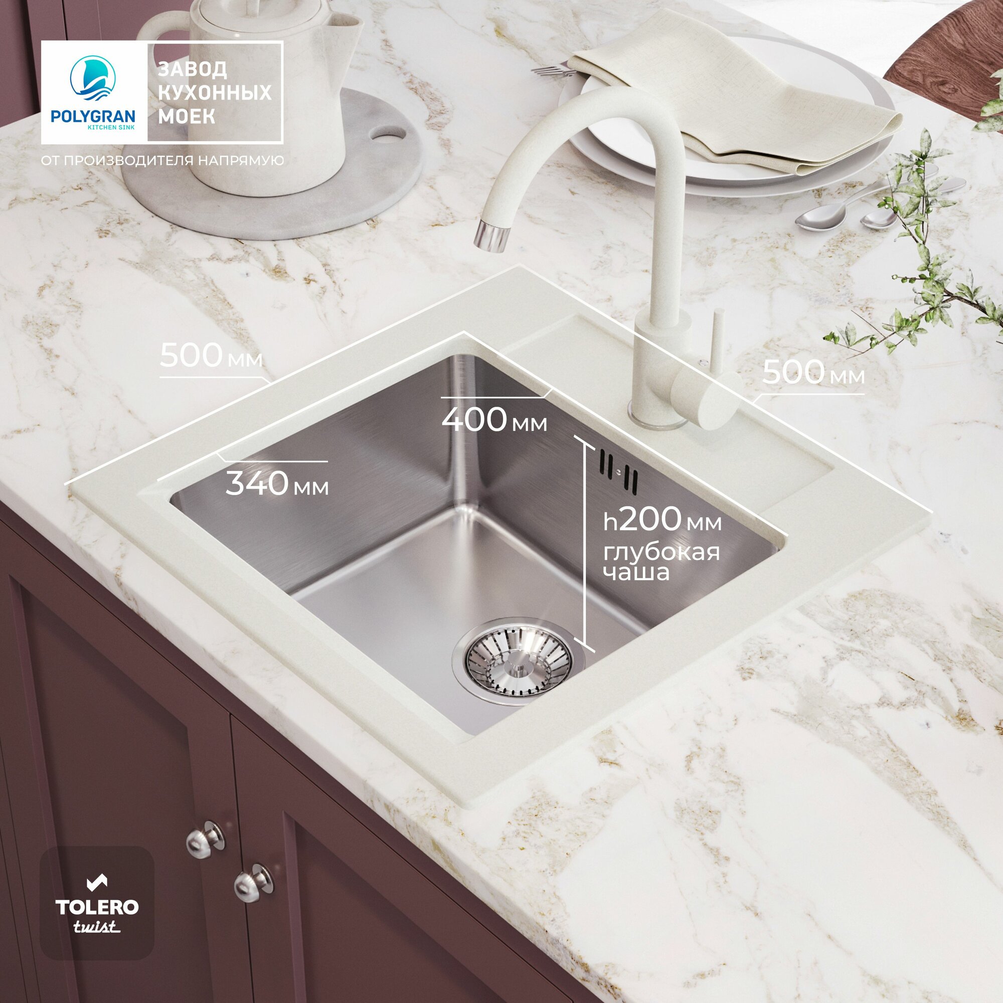 Мойка для кухни TOLERO Twist TTS-500 - идеальный выбор для тех, кто ценит стиль и функциональность. Эта модель сочетает в себе материалы, такие как искусственный камень и нержавеющая сталь. Благодаря квадратной форме и дизайну, данная мойка гармонично впишется в любой интерьер кухни, добавляя современный акцент.
