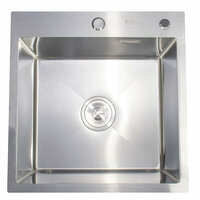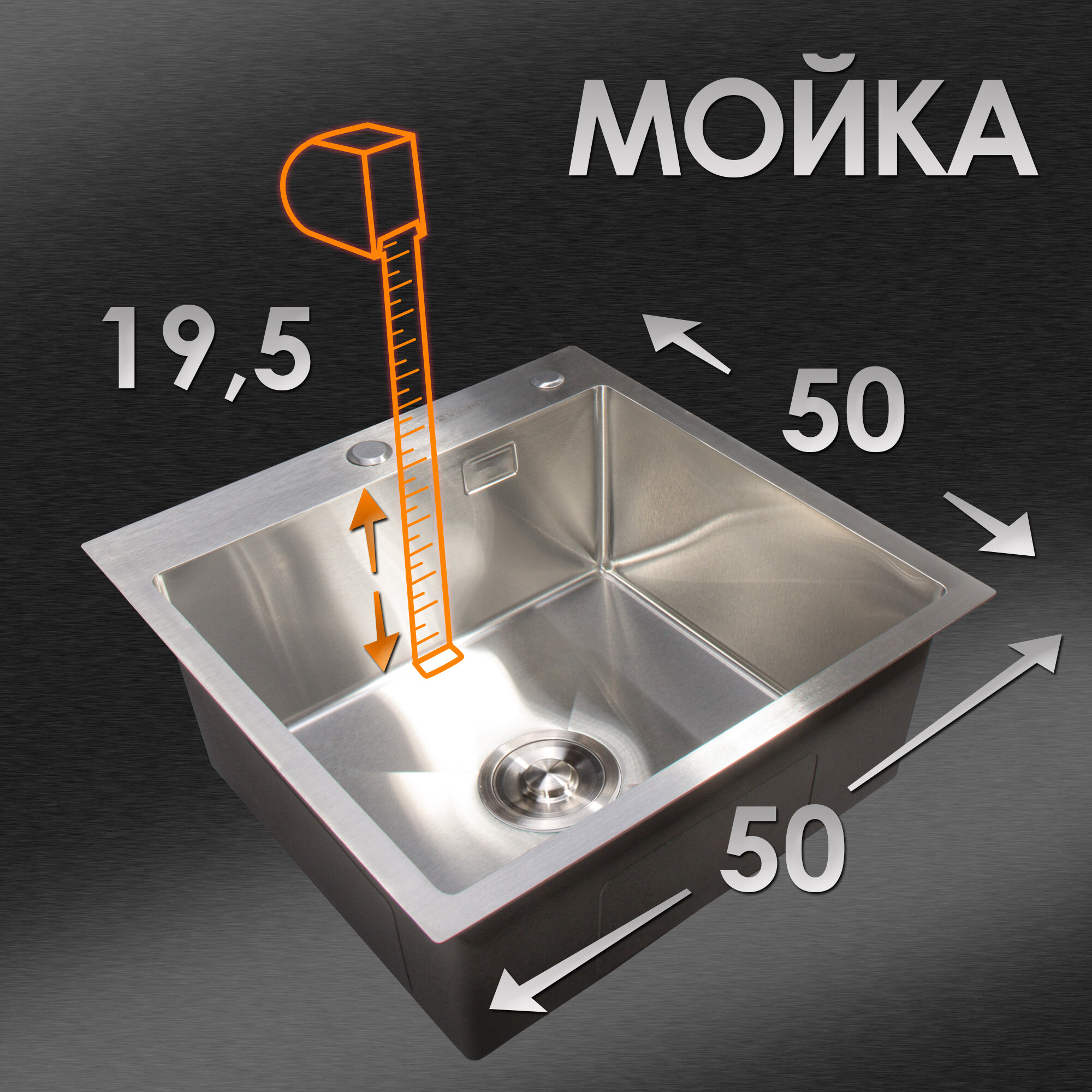 Квадратная форма кухонной раковины и чаши позволяет максимально эффективно использовать пространство на кухне. Размеры мойки для кухни составляют 50*50 см, а глубина чаши – 19.5 см. Длина и ширина чаши – 40.0 и 45.0 см соответственно.
