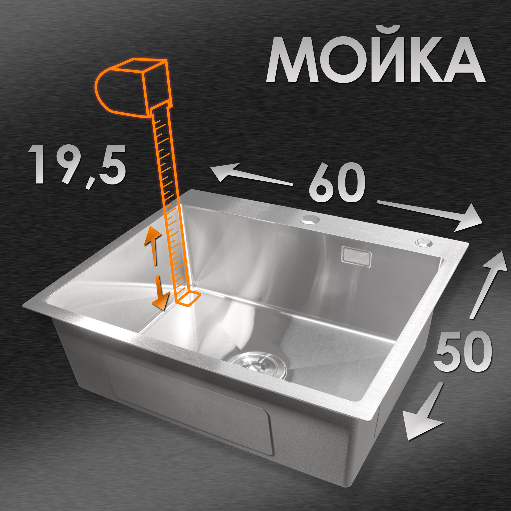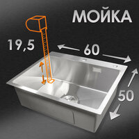 Квадратная форма кухонной раковины и чаши позволяет максимально эффективно использовать пространство на кухне. Размеры мойки для кухни составляют 50*60 см, а глубина чаши – 19.5 см. Длина и ширина чаши – 40.0 и 55.0 см соответственно.
