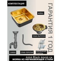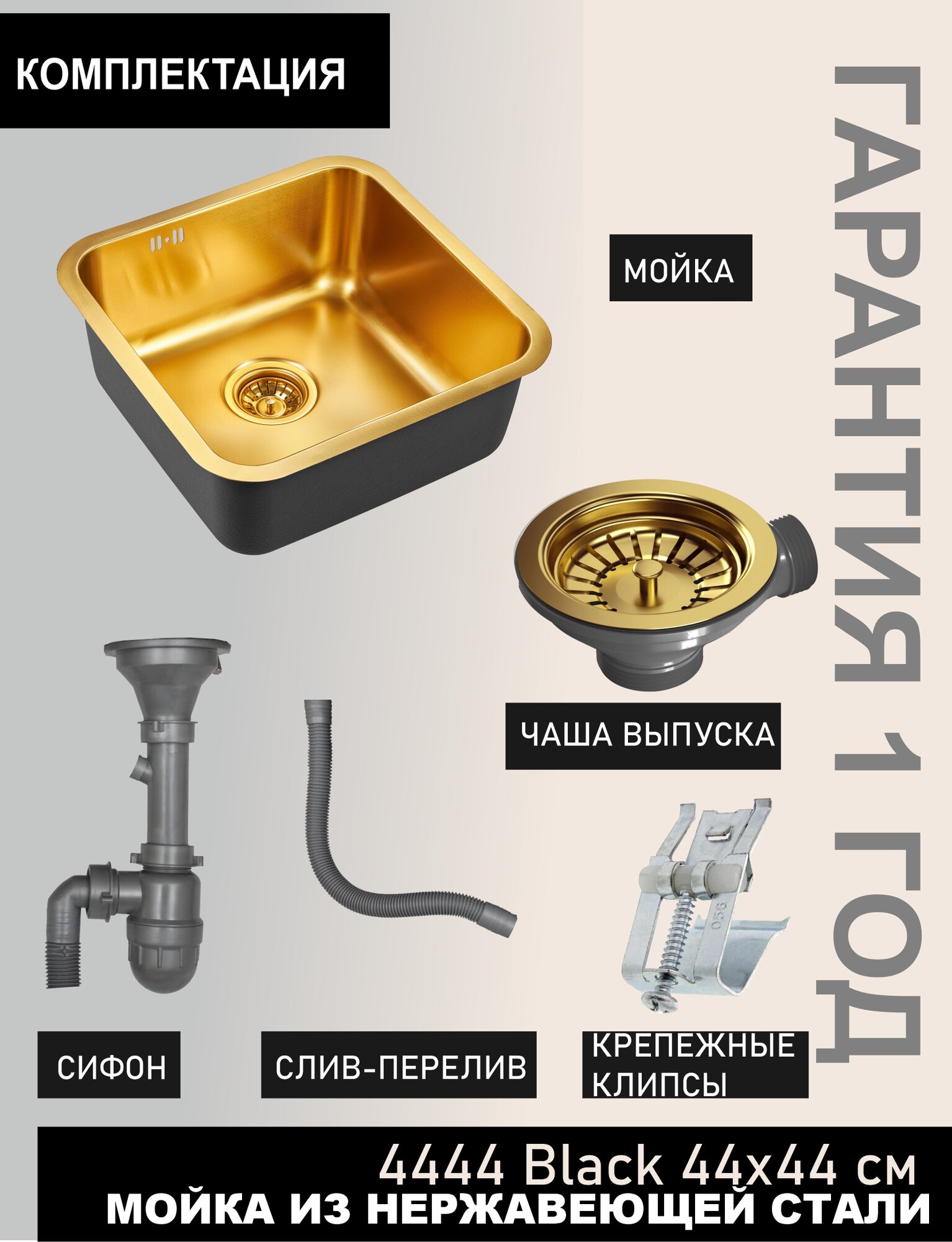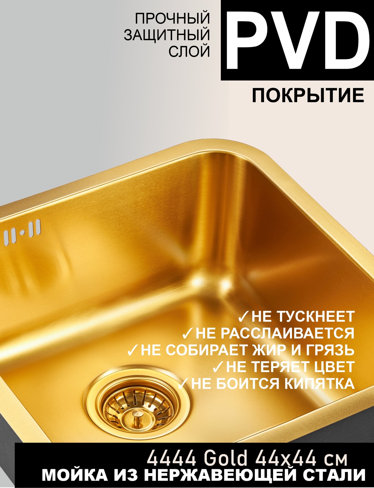 Купить Мойка для кухни врезная 4444 Gold 44х44 см золото под столешницу. В комплекте сифон, арматура, перелив с доставкой по всей России.