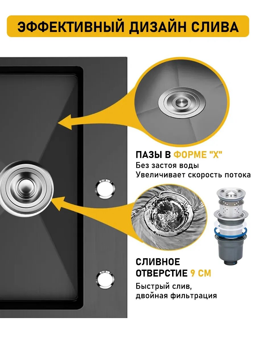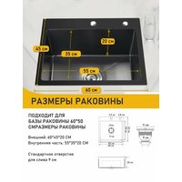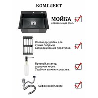 Красивая и надежная мойка для кухни из премиальной нержавеющей и находка для любой категории кухонных гарнитуров. Глубокая и компактная стальная раковина в цвете графит воплощение практичности в быту. Антибактериальное покрытие PVD всегда остаётся чистым, не собирает воду и частицы грязи из-за особенности конструкции и покрытия. В комплекте к мойке 60 на 45 идет сливная арматура, удобный боковой коландер/решетка для сушки посуды, мытья фруктов и овощей и размораживания продуктов. Врезной дозатор для моющего средства избавит от лишних предметов в рабочей зоне. Вместительная чаша мойки нерж глубиной 21 см позволяет расположить в мойке крупногабаритную посуду. Специальное шумоизоляционное покрытие поглощает шум воды из крана и позволяет с комфортом мыть посуду в тишине. Раковину для кухни можно установить как сверху так и снизу столешницы. Нержавеющая мойка черная 6045 подходит для подстольного, настольного монтажа и как врезная. Эргономично встроенная кухонная мойка оптимизирует пространство снаружи и внутри. Любая столешница и накладная конструкция смотрятся единым целым, гармонично вписываются в стильный интерьер. На мойке с круглым сливом предусмотрено два отверстия: одно для смесителя, второе можно использовать под дозатор или кран для фильтрованной воды. Прямоугольная железная раковина изготовлена из качественной нержавеющей стали с большим запасом прочности, которая применяется в пищевой промышленности и не боится агрессивной среды, бытовой химии, царапин и прослужит долгие годы. Нержавейка не подвержена коррозийным изменениям, деформациям и царапинам. Уникальное nano покрытие не впитывает грязь, жир, масло и устойчиво к воздействию агрессивных сред. Квадратная встраиваемая мойка из нержавеющей стали изменит ваше представление об удобстве в быту.