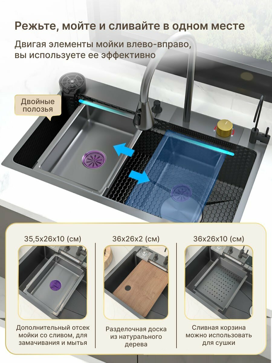 Мойка для кухни WULIAN Нержавеющая сталь марки 304 многофункциональная врезная мойка водопад 75*45cm: сравнение цен, характеристики, фото, актуальное наличие и цены.