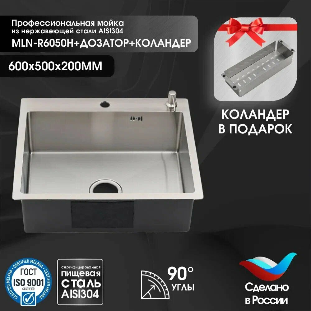 Мойка из нержавеющей стали MELANA MLN-R6050H ProfLine, сатин, прямоугольная, 60х50 см, с большой чашей, дозатором и коландером: сравнение цен, характеристики, фото, актуальное наличие и цены.