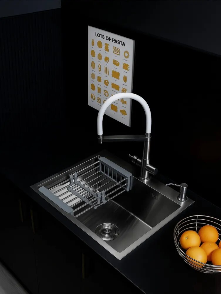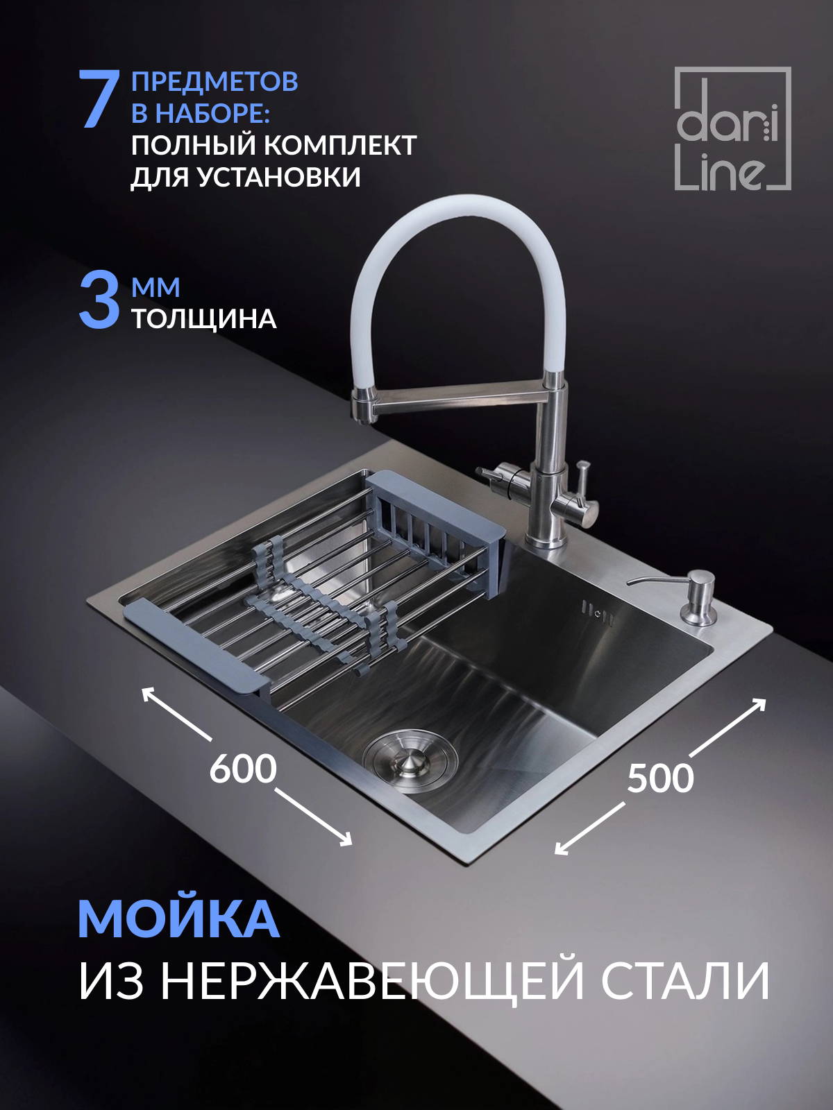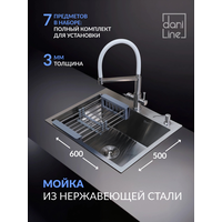 Кухонная мойка DARILINE универсального монтажа изготовлена из высококачественной нержавеющей стали толщиной от 1 до 3 мм. Химический состав и свойства материала делают раковину наиболее подходящей для применения в пищевой промышленности. Мойка из нержавеющей стали для кухни показывает высокие характеристики коррозийной стойкости в агрессивных средах. В данной модели раковины для кухни двойная шумоизоляция со всех сторон, что позволяет максимально снизить звук от потока воды. Мойка из нержавейки для кухни имеет антибактериальное PVD покрытие. Поверхность мойки на кухне с таким покрытием наиболее проста в уходе, устойчива к механическим повреждениям, высоким температурам. С нее легко удалить следы жира, грязи и разводы от воды. Глубина мойки для кухни 210 мм делает ее вместительной и удобной в эксплуатации. Широкий диаметр слива, препятствует возникновению засоров. - Глубокая чаша, защита от брызг, Антишумное покрытие, снижает шум на 50. - толщина стали 3 мм, повышенная прочность. Раковина проста в установке и имеет универсальный тип монтажа: накладная, врезная или под столешницу. Мойка укомплектована сифоном с защитой от перелива, врезным дозатором для жидкого мыла или средства для мытья посуды и коландером. Коландер размещается в чаше и позволяет размораживать продукты или сушить посуду после мытья, позволяя более рационально использовать пространство. Врезной дозатор также поможет освободить место на кухне. Раковина для кухни.