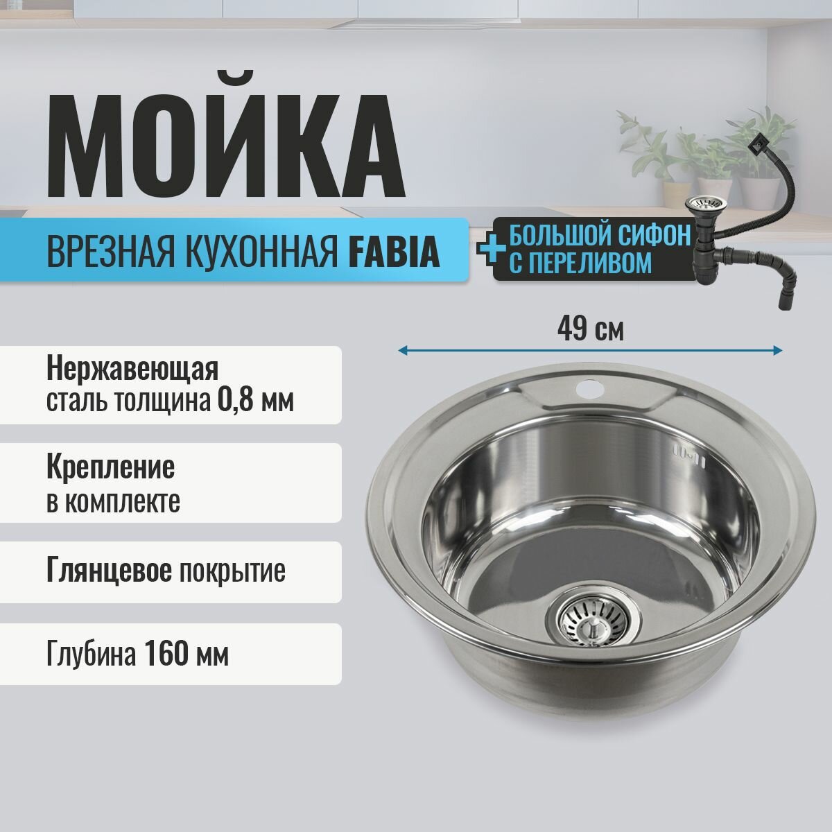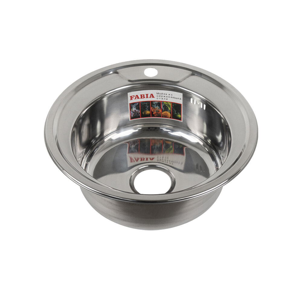Мойка кухонная FABIA врезная круглая, 49 см, глубина 180 мм, большой сифон с переливом: сравнение цен, характеристики, фото, актуальное наличие и цены.