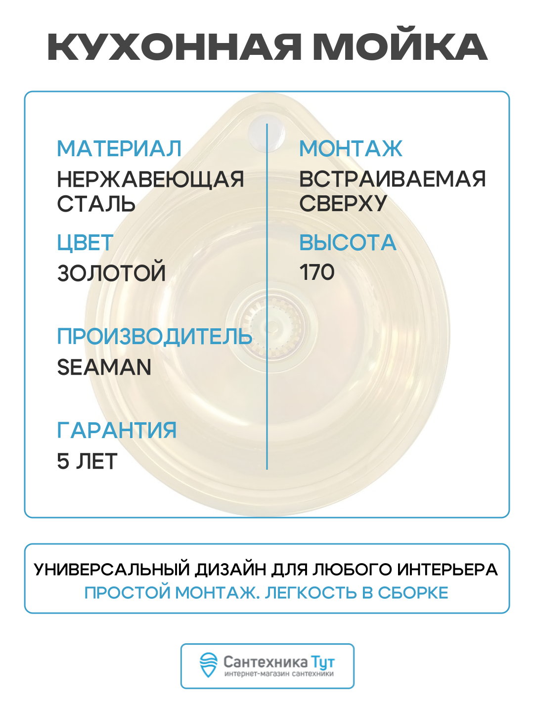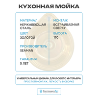 Мойка кухонная Seaman Eco SWT-3945, нержавеющая сталь, врезная, круглая, золотая, 45х39 см: сравнение цен, характеристики, фото, актуальное наличие и цены.