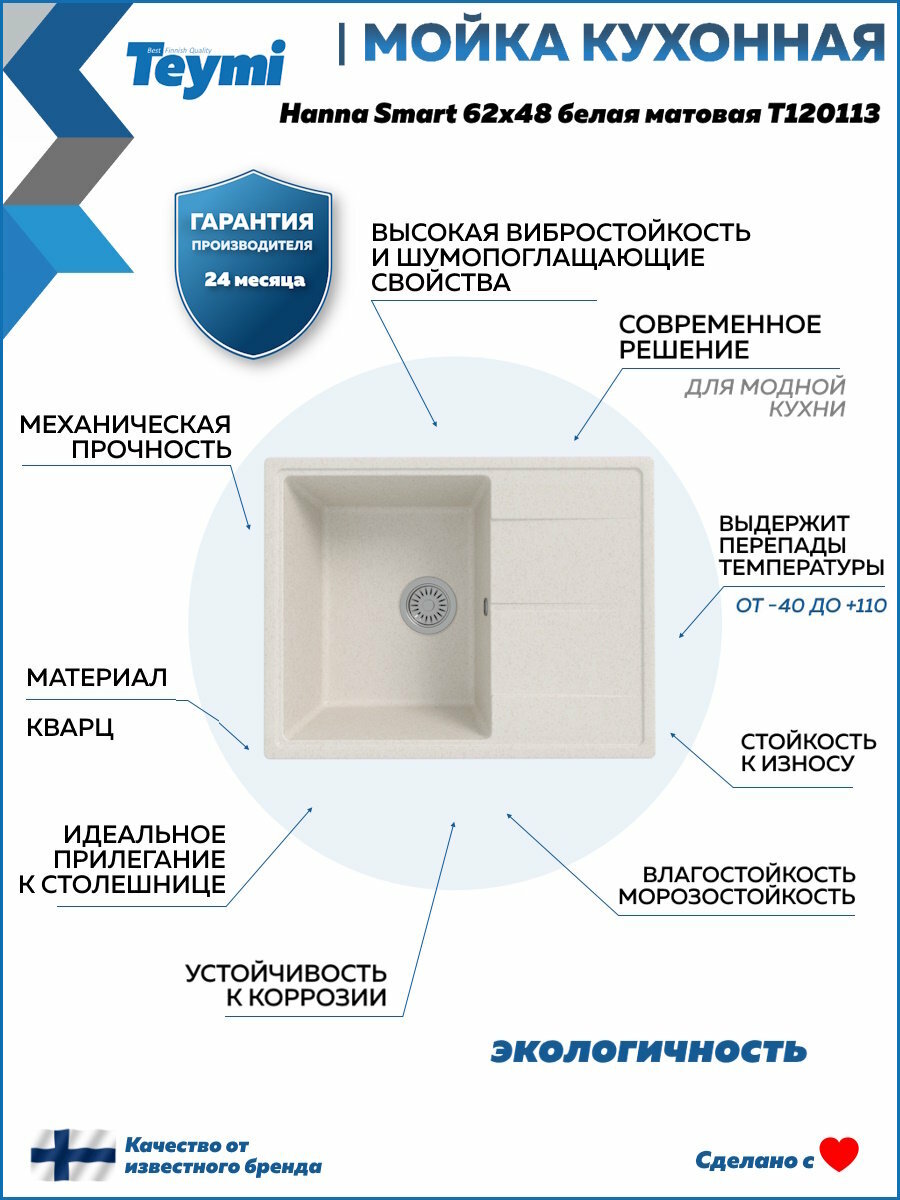 Кухонная мойка 62x48 белая матовая Teymi Hanna Smart T120113 — универсальное решение для стильной и функциональной кухни