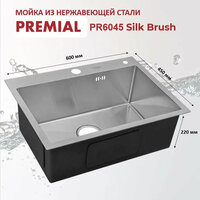Мойка для кухни из нержавеющей стали премиум качества Premial — это воплощения стиля, надёжности и комфорта. Все мойки марки Premial отличаются эргономичным дизайном, изысканностью и долговечностью! При производстве используются только первоклассные надёжные материалы и комплектующие. Мойки выполнены вручную из пищевой нержавеющей стали 3 мм. Раковина для кухни Premial 60Х45 изготовлена из высококачественной нержавеющей хирургической стали марки AISI 304, которая также применяется при производстве медицинских приборов и столовых приборов премиального сегмента. Сталь данной марки является абсолютно экологически безопасной для здоровья человека. Марка хирургической стали AISI 304 содержит 18% хрома и 8% никеля, что обеспечивает ее максимальную защиту от коррозии. Она является кислотостойкой и выдерживает краткосрочное поднятие температуры до 900 градусов по Цельсию. Сплав нержавеющей стали с никелем и хромом защищен от образования известкового налета и устойчив к агрессивным моющим средствам. Мойка кухонная нержавеющая сталь прямоугольной формы имеет размеры 60 х 45 х 22 см. Размер чаши: 45 х 35 х 21 см. Большая глубина чаши 22 см делает мойку вместительной и удобной в эксплуатации, нет разбрызгивания капель воды. Малый радиус скругления углов чаши — для большей вместимости. Минимальная мебельная база: 60 см. Два отверстия на мойке для установки смесителя и дозатора, смеситель в комплект не входит, его можно купить в нашем магазине. Кухонная раковина без шумна, шумоподавляющее покрытие в цвет мойки состоит из двух компонентов: резиновой накладки на дне и специального противошумного состава За мойкой на кухню очень легко ухаживать с помощью бытовой химии, так как она обладает капле-отталкивающими и антибактериальными свойствами. Поверхность мойки обработана специальным методом «сатинирования», имеет богатый внешний вид и стойка к загрязнениям. Мойка имеет многовариантность установки, в зависимости от дизайна, материала столешницы и ваших предпочтений: врезной способ монтажа, монтаж вровень со столешницей, подстольный монтаж. Водосливная арматура в комплекте выполнена из первичного пластика. Выпуск-сливная «корзинка» с диаметром 114 мм снабжена съёмным «ситечком» и крышкой-затвором, которые удобно вынимать, чтобы почистить слив . На крыле мойки — гравировка логотипа Premial® и марки стали хирургическая нержавеющая сталь AISI 304. Мойка имеет качественную и надежную упаковку. Срок службы мойки более 10 лет!