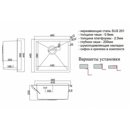 Особенности: Мойка выполнена из нержавеющей стали марки SUS 201 Глубокая вместительная моечная чаша 200 мм с радиусами скруглений R10 мм Толщина стали 0,9 мм (кант 2 мм) Универсальный монтаж (возможна установка в один уровень, подстольный или врезной монтаж) Шумоизоляционное покрытие и накладки на обратной стороне