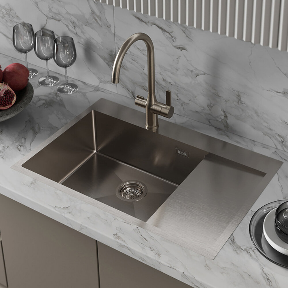 Мойки Haze отличаются современным дизайном и ручной технологией производства, что позволяет добиться идеальной геометрии – малый радиус закругления углов увеличивает рабочее пространство и помогает избежать «мертвых зон». Выполнение повседневных задач становится еще проще: в мойке удобно разместить большое количество посуды и мыть крупные предметы, такие как противень. Вместительное крыло справа от чаши возьмет на себя функцию сушки чистой посуды, а плоский сифон поможет сэкономить полезное пространство. Подходит для кухонных тумб от 55 см. • Мойки IDDIS® изготовлены из качественной нержавеющей стали, которая не боится ни бытовой химии, ни царапин. Ручная обработка позволяет сохранить изначальную толщину листа стали (1,2 мм) на всех элементах мойки, что обеспечивают ее надежность, ударопрочность и износостойкость. • Специальное покрытие Silenon и резиновые накладки на оборотной стороне чаши снижают шум при использовании мойки. • Гарантия на мойки IDDIS® – 15 лет.