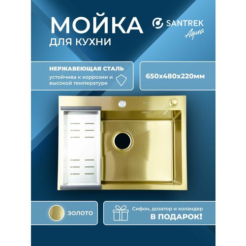 Купить Мойка нержавеющая врезная SANTREK 650х480х220 толщина 3 мм золото SANTREK с доставкой по всей России. Мойка нержавеющая врезная SANTREK 650х480х220 толщина 3 мм золото SANTREK: сравнение цен, характеристики, фото, актуальное наличие и цены.