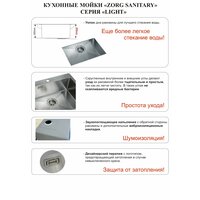 Мойка ZORG ZL R 590-2-510-R производится из промышленной нержавеющей стали марки SUS 201. Чаша мойки выполнена из стали толщиной 1.2 мм, кант имеет толщину 2 мм. Скруглённые внешние и внутренние углы придают мойке эстетичный и современный внешний вид и облегчают уход за поверхностью в процессе использования.